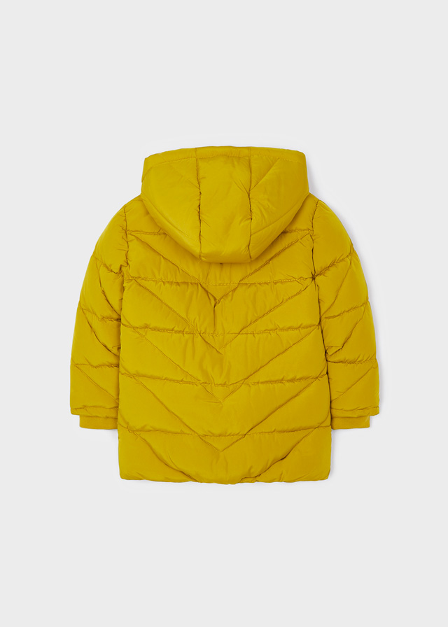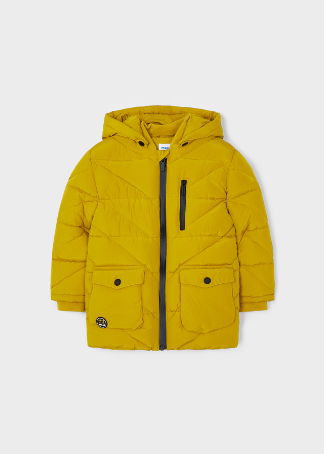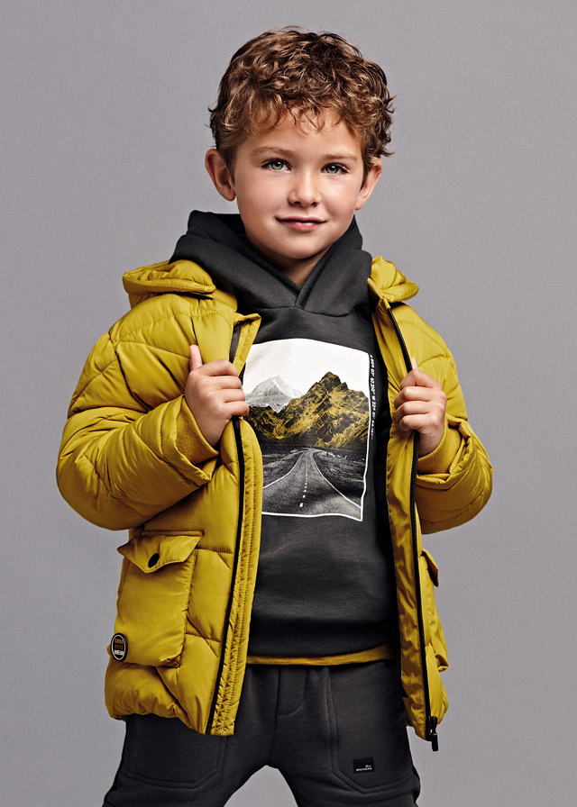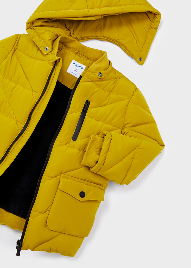 Chlapecký kabát s dlouhým rukávem. Odnímatelná kapuce. Přední, centrální zapínání na zip. Prošívané provedení. Funkční přední kapsy.