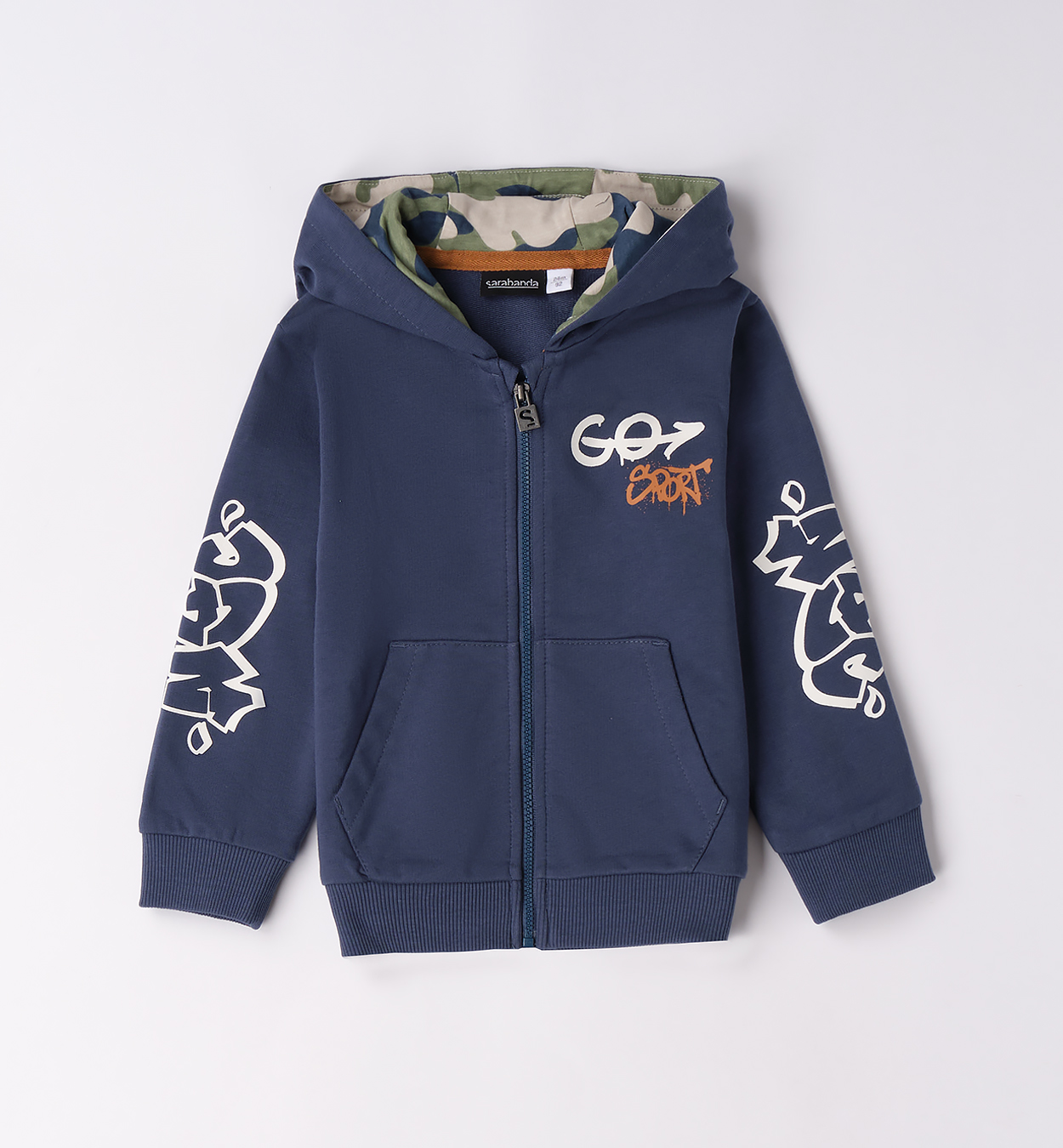 Streetová mikina s kapucí a potiskem. Stylová mikina na zip pro malé dobrodruhy s výrazným graffiti potiskem na rukávech a hrudi. Podšívka kapuce v maskáčovém stylu dodává moderní vzhled. Díky praktickému zapínání a příjemnému materiálu je ideální na každodenní nošení do školky i na ven. Skvěle ladí s tepláky ze stejné kolekce.