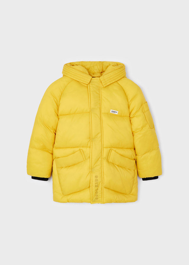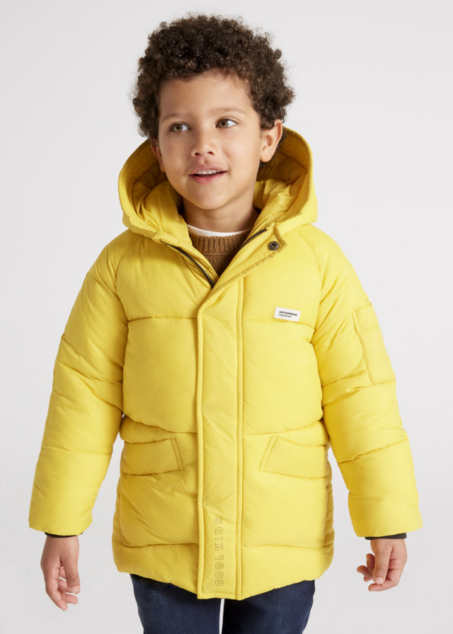 Chlapecký kabát s dlouhým rukávem. Provedení s kapucí. Přední zapínání na zip s patentními knoflíky.