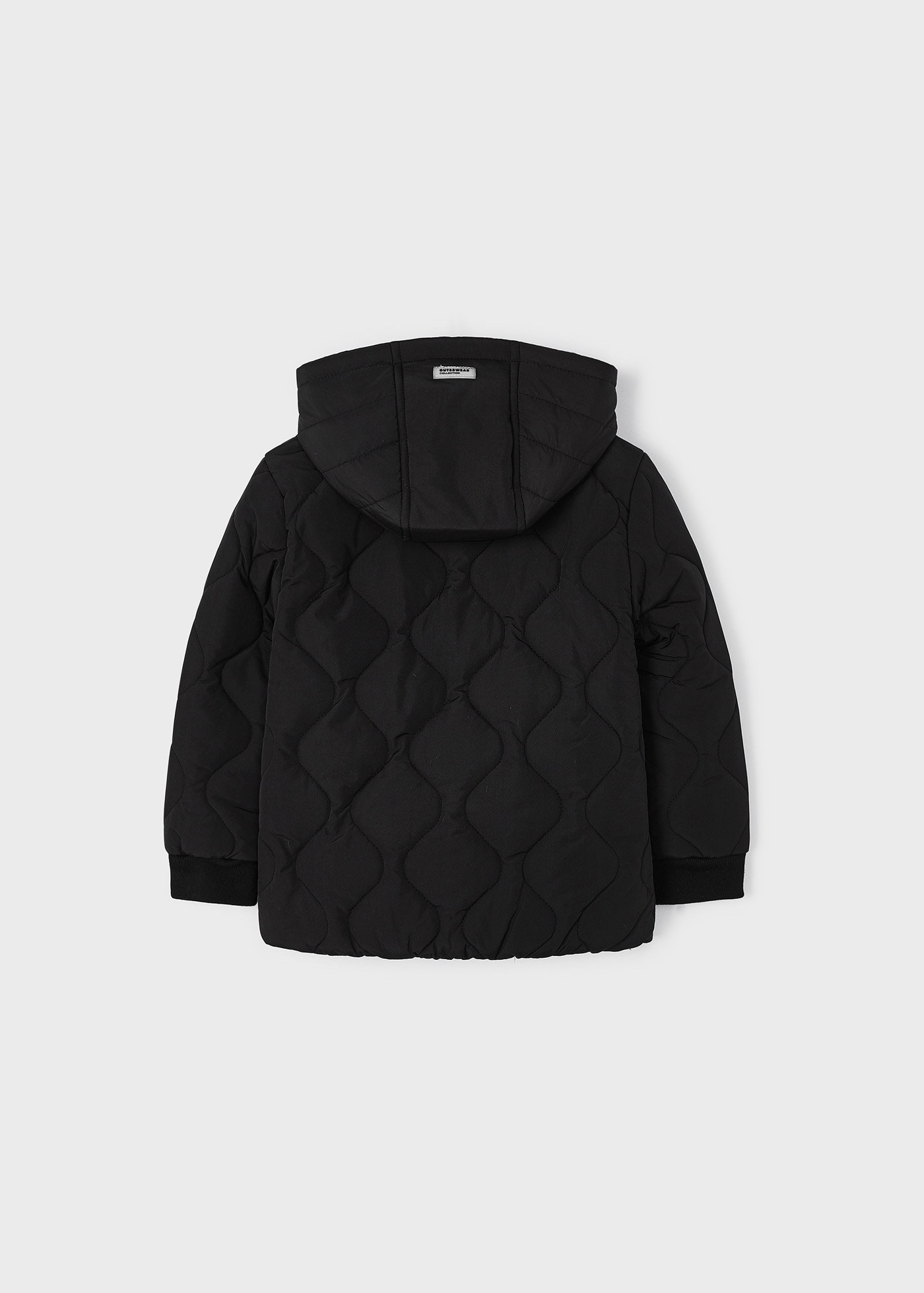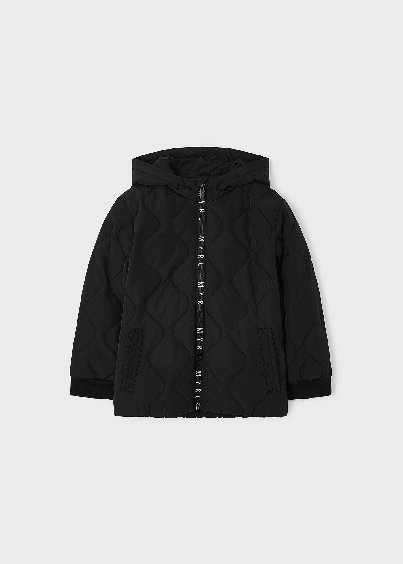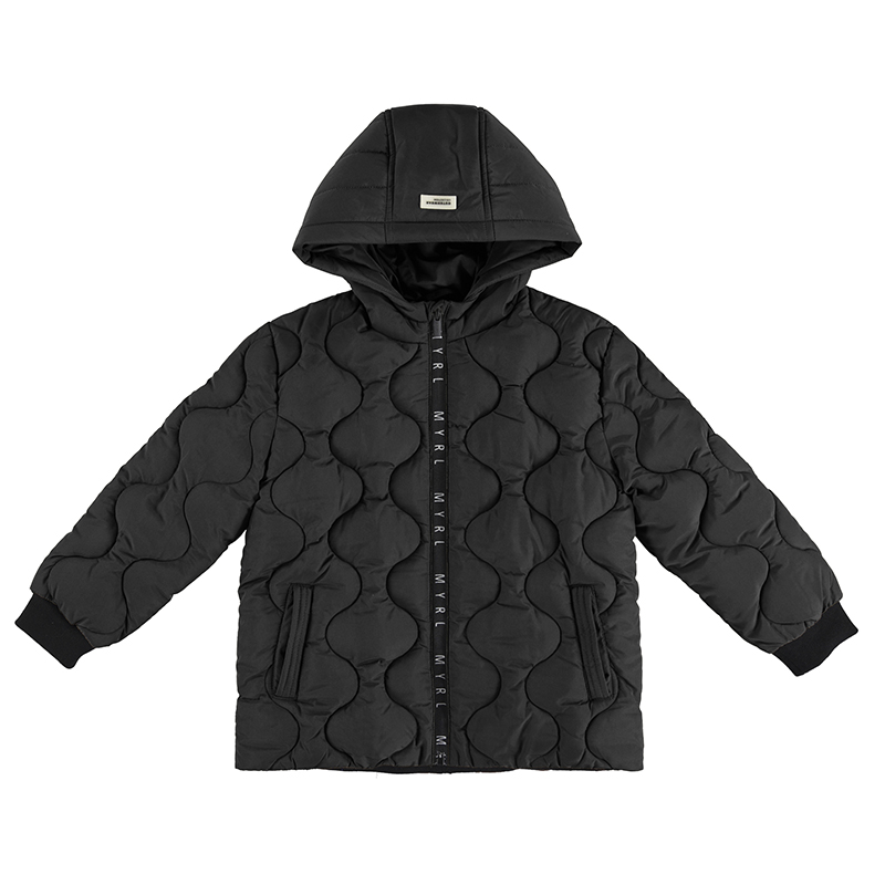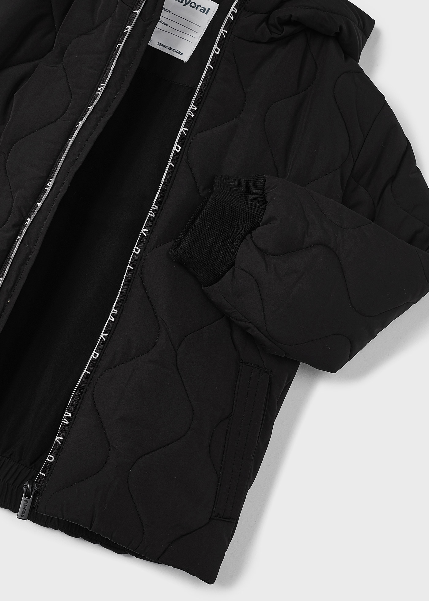 Chlapecký kabát s dlouhým rukávem. Provedení s kapucí. Přední, centrální zapínání na zip.