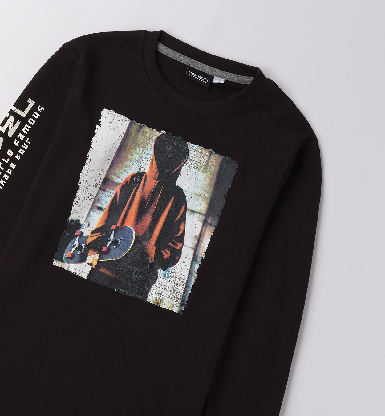 Trendy chlapecké tričko se skateboardistou. Černé chlapecké tričko s dlouhým rukávem a potiskem skateboardisty v kapuci. Styl doplňují nápisy na rukávu. Skvělý kousek pro malé sportovní nadšence a fanoušky street stylu.