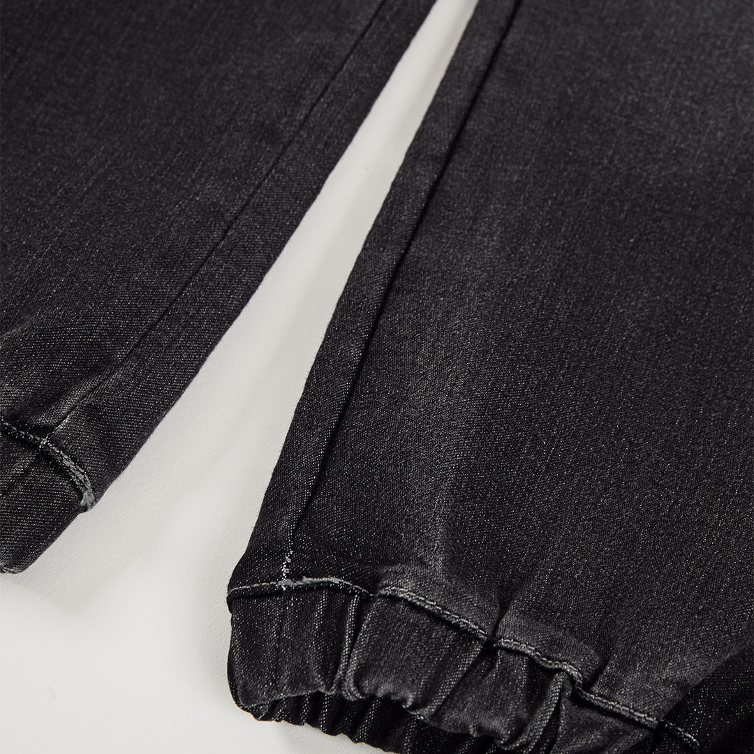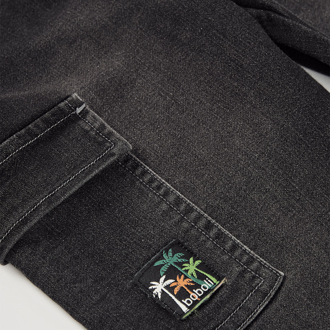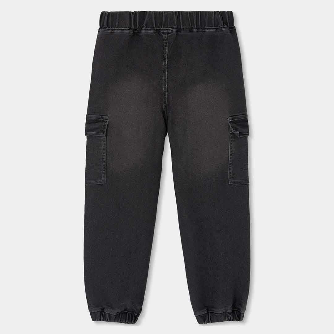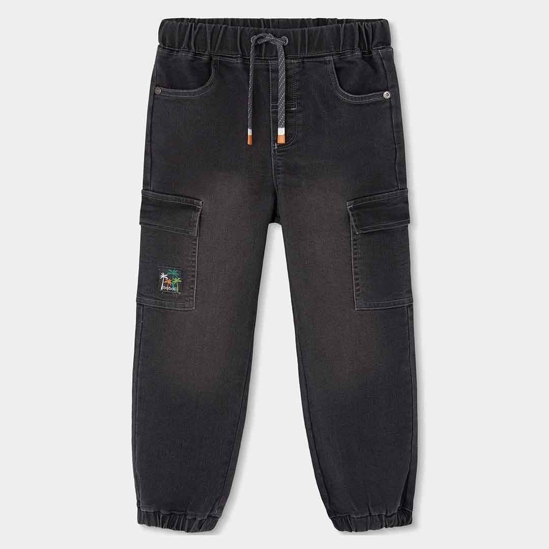 Chlapecké džínové kalhoty cargo. Chlapecké džínové kalhoty cargo s elastickým pasem, kapsami na nohavicích a nášivkou, praktické a pohodlné pro aktivní dny.