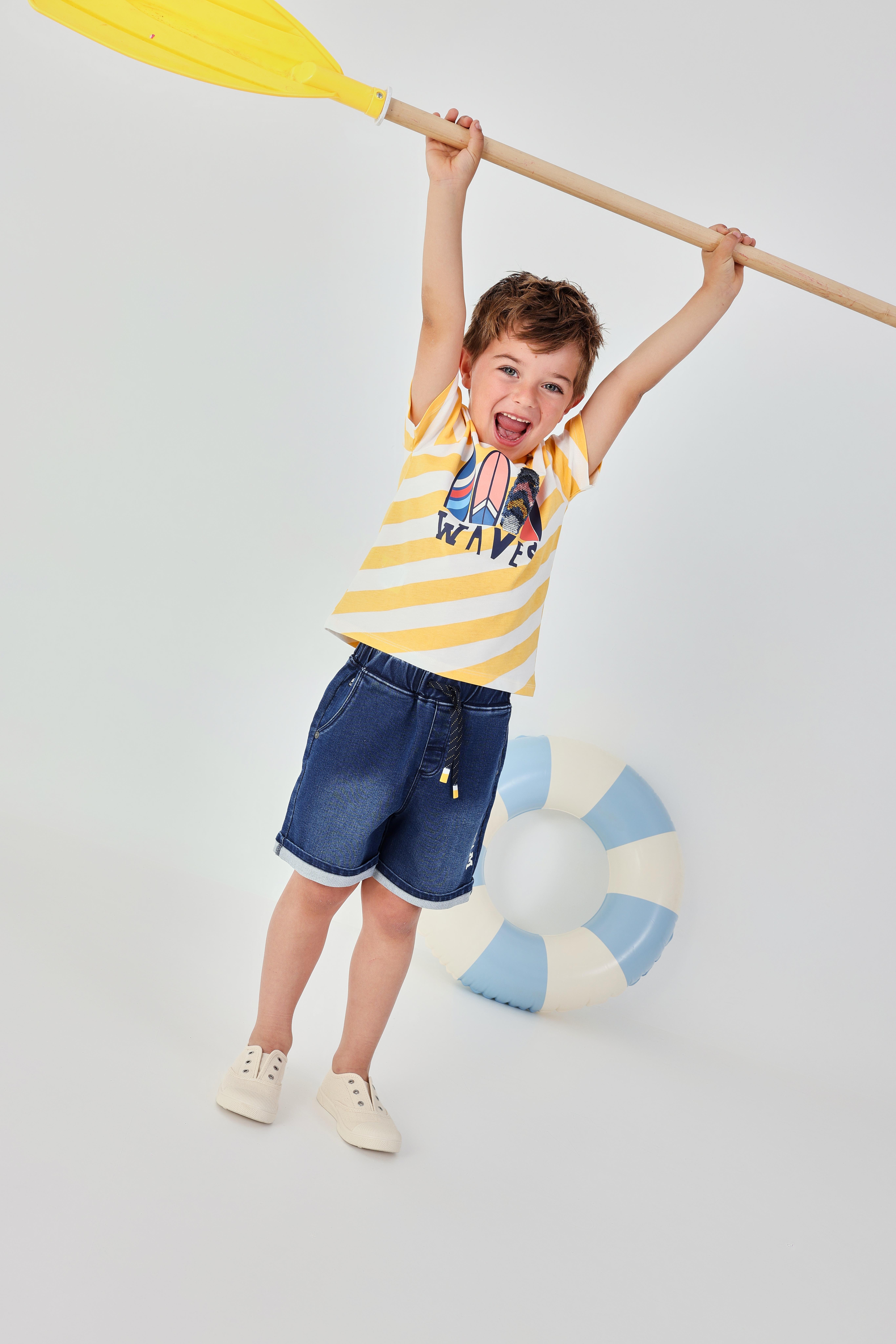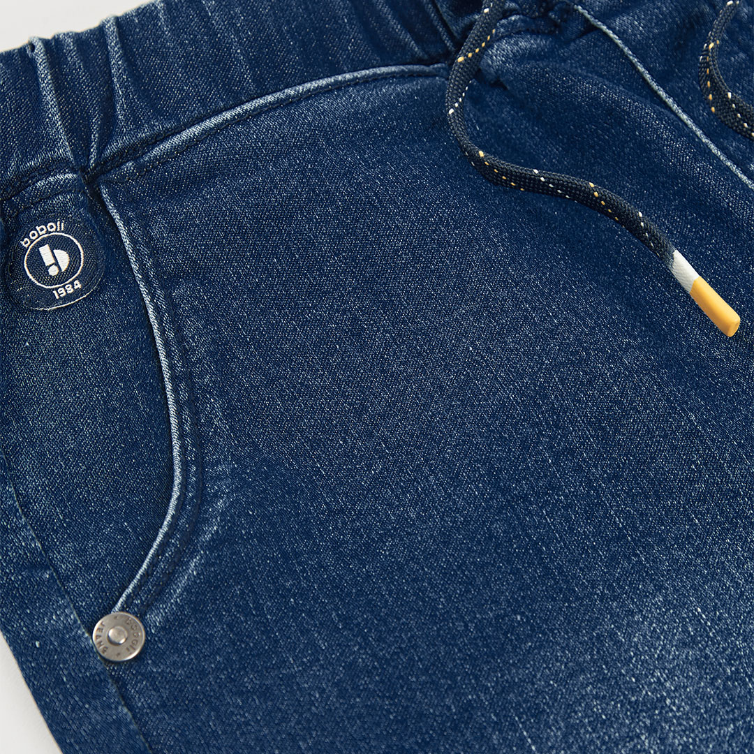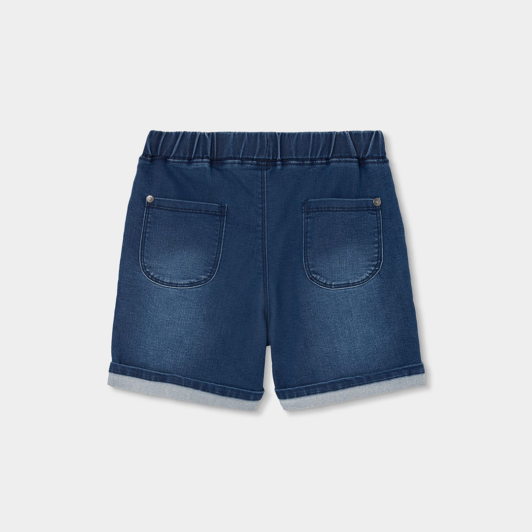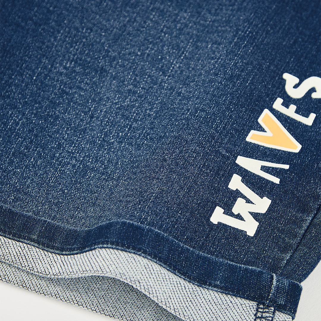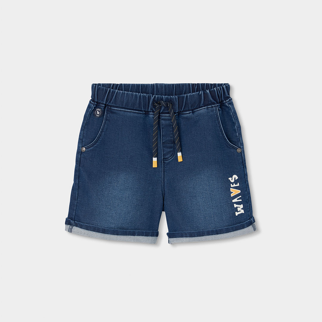 Chlapecké džínové šortky. Tmavě modré chlapecké džínové šortky s elastickým pasem a nápisem SAVES, pohodlný střih je ideální na letní hry a každodenní nošení.