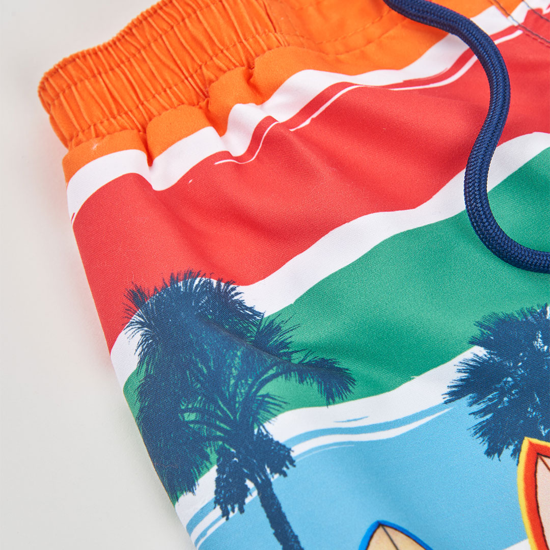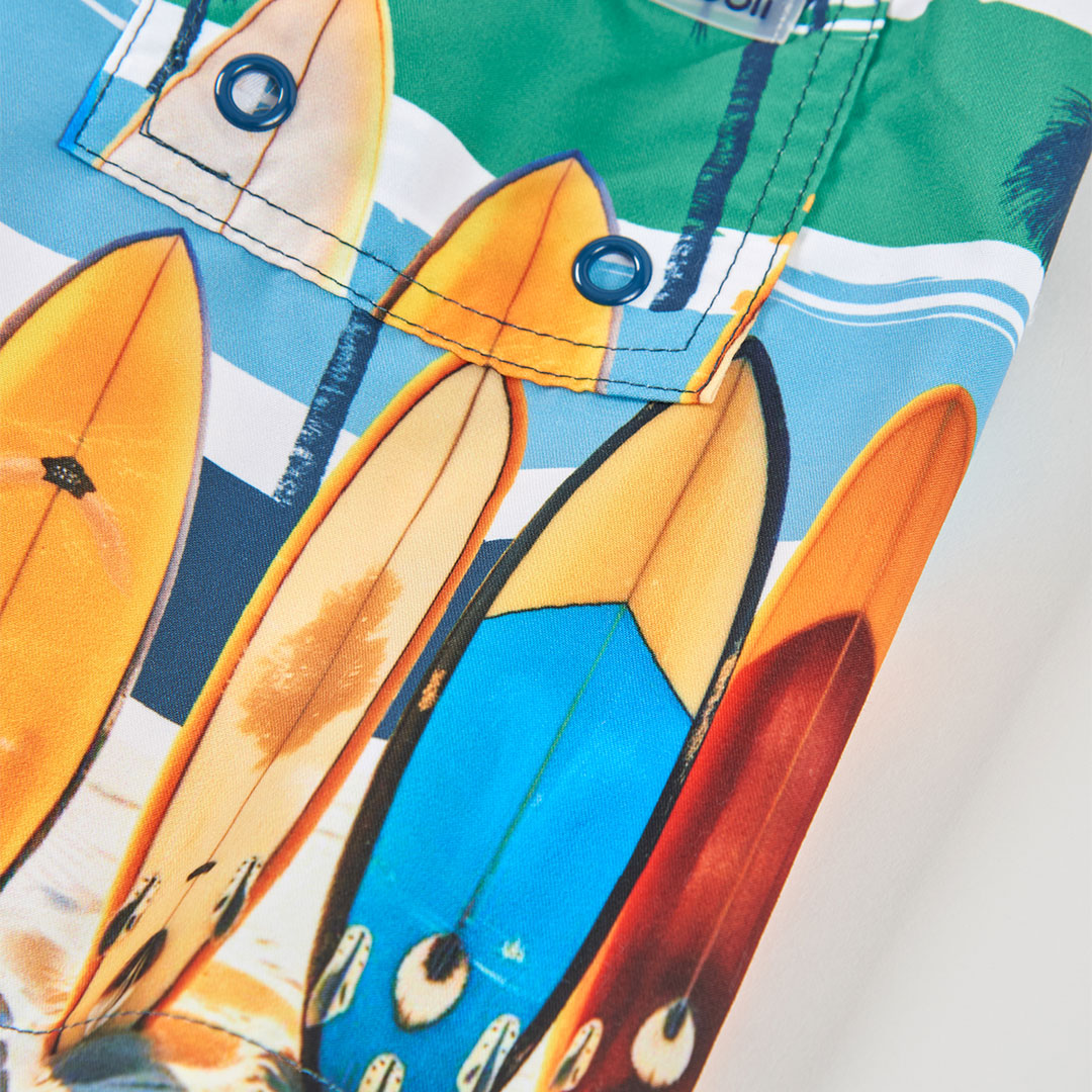 Chlapecké plavky s motivem surfů a palem. Barevné koupací šortky s plážovou scénou: surfová prkna zapíchnutá v písku, palmy a pruhované letní nebe. Lehké, rychleschnoucí provedení se stahováním v pase ideální k moři, bazénu i na letní prázdniny.