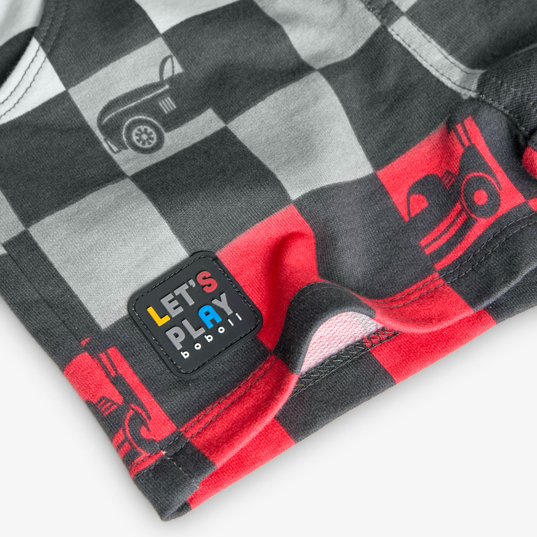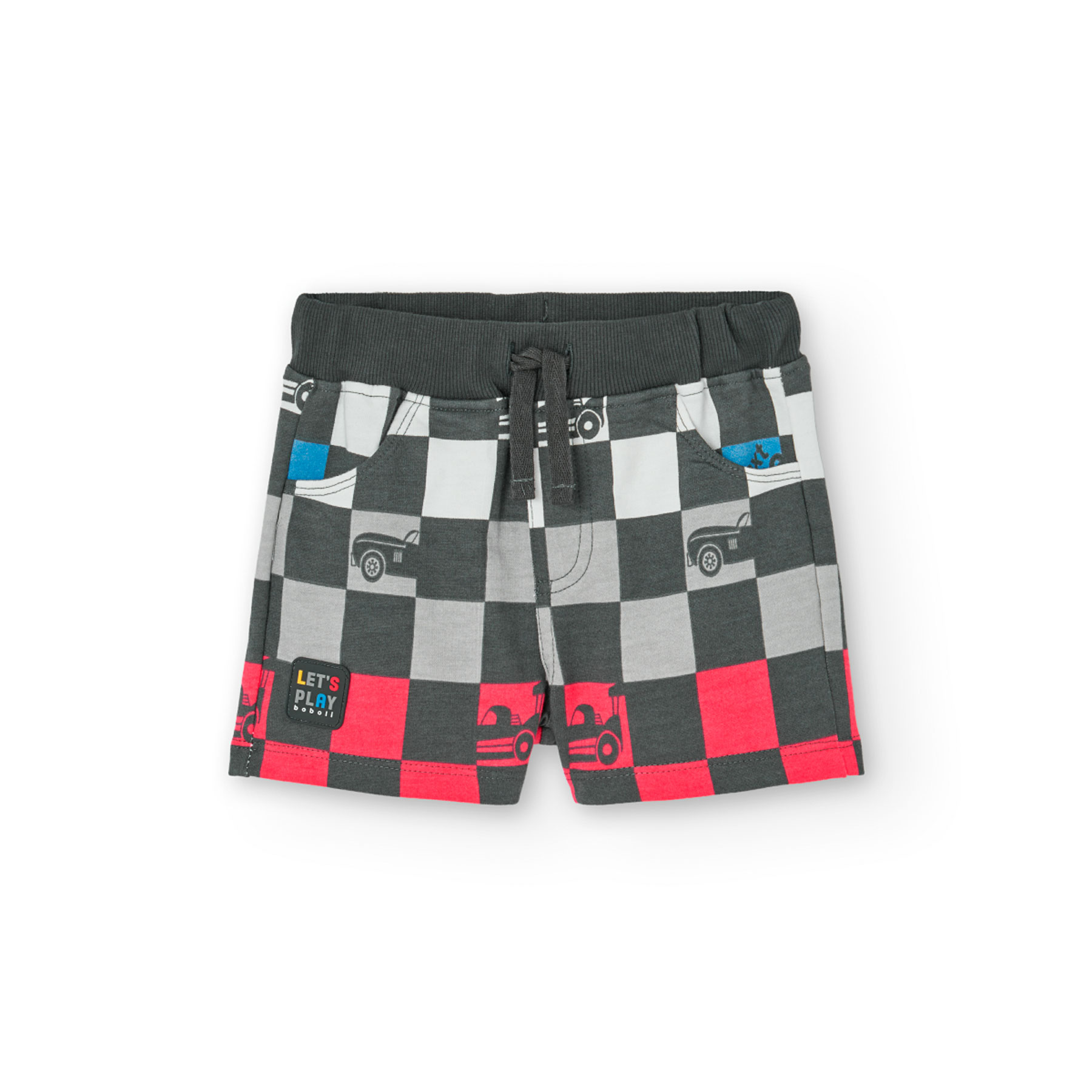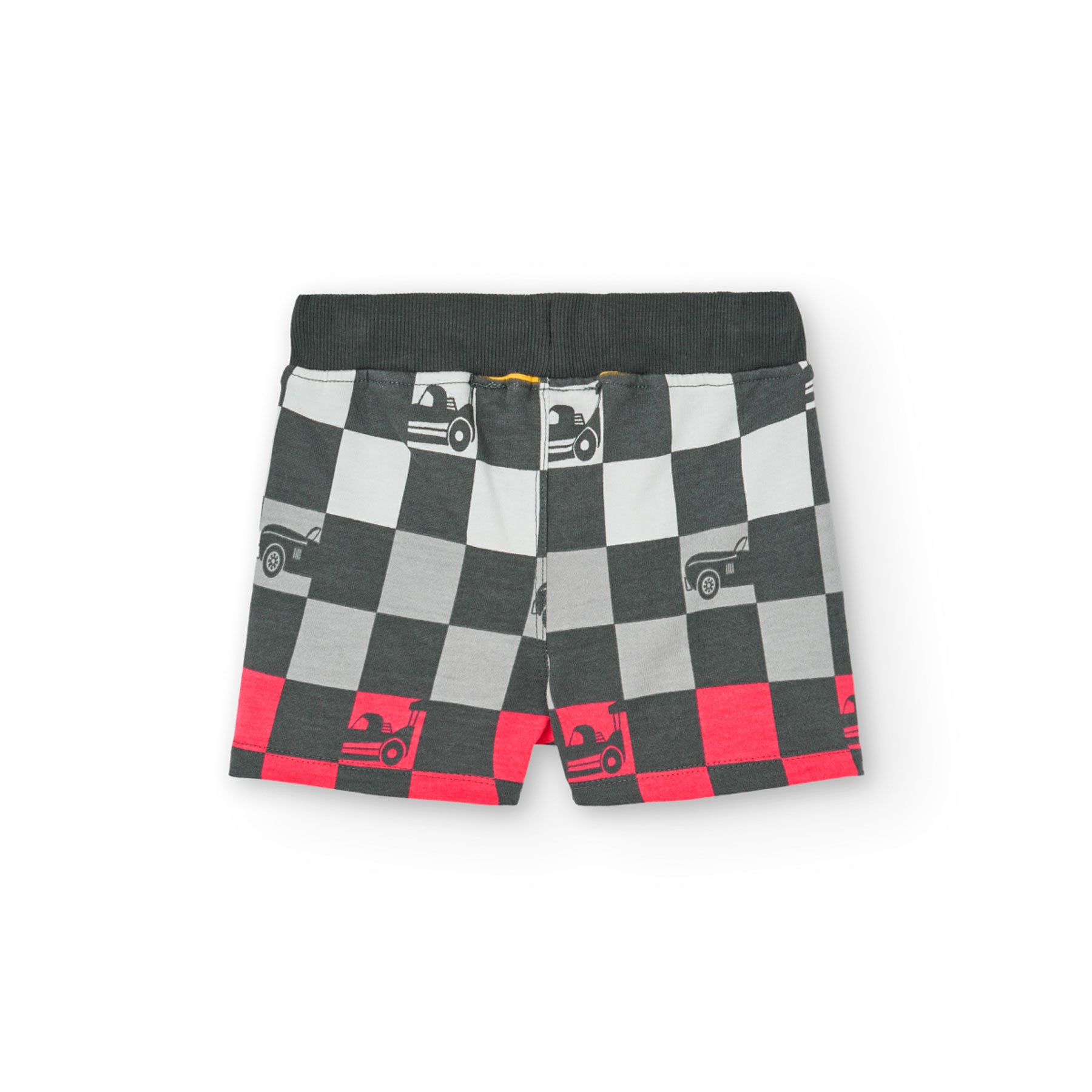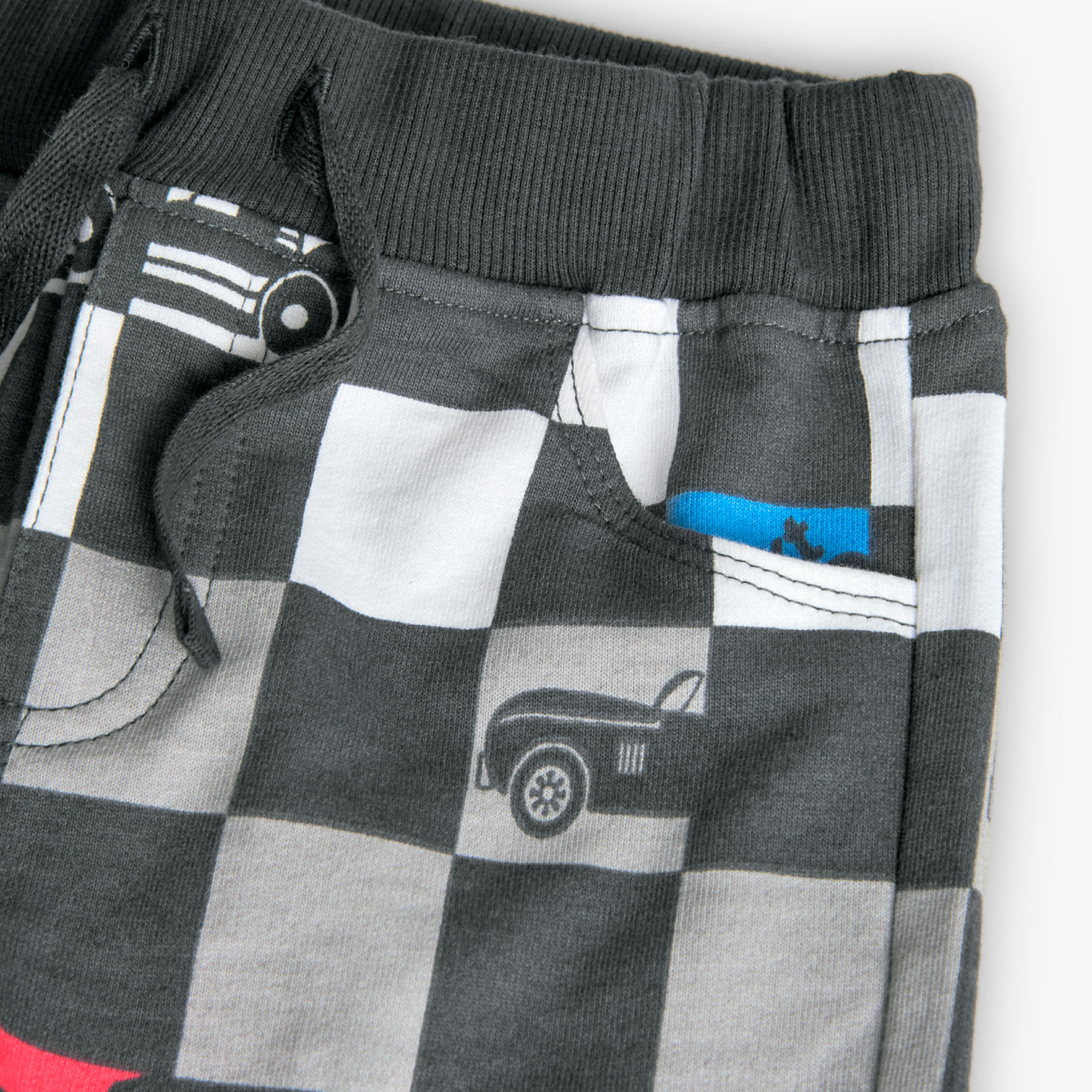 Letní klasika. Pohodlné kraťasy s kostkovaným potiskem a detaily auta, vhodné pro letní dny.