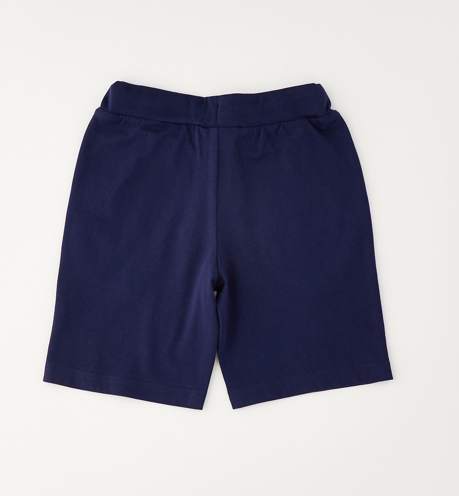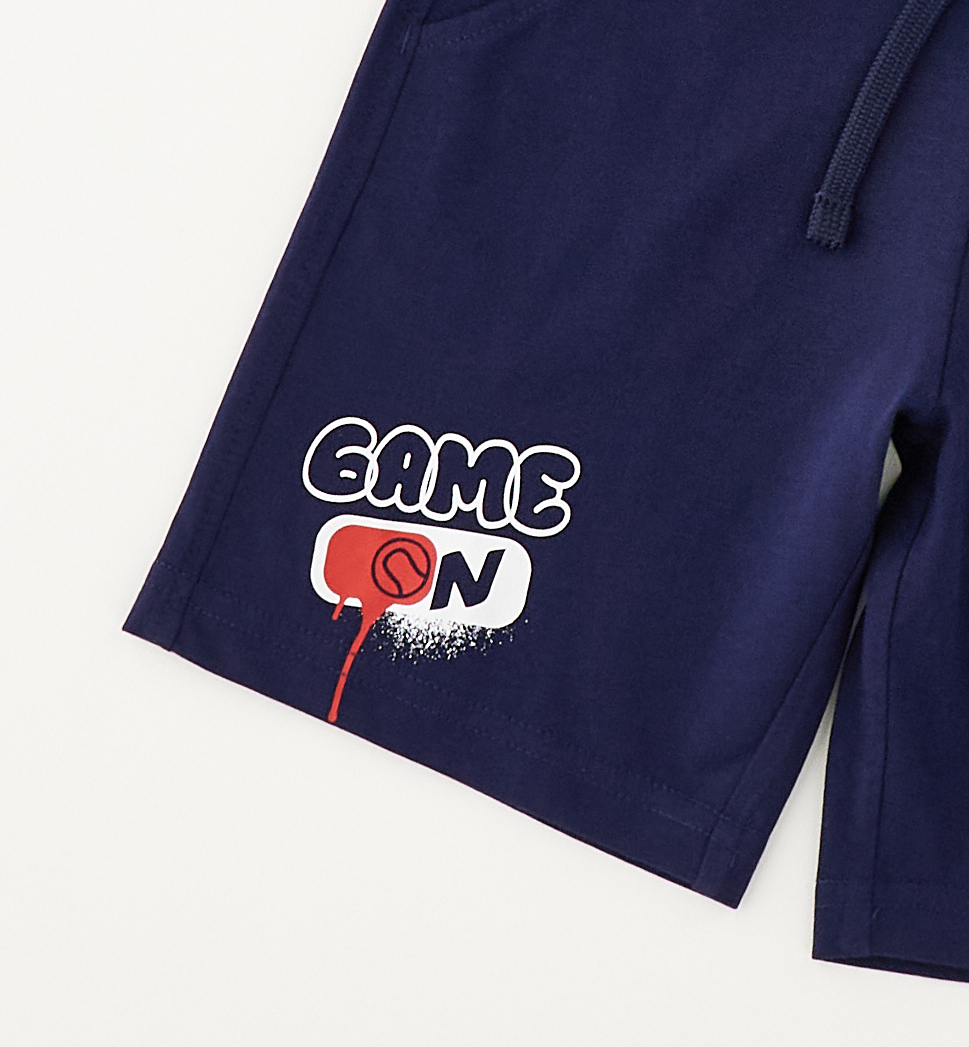 Chlapecké tmavě modré kraťasy Game On. Tmavě modré kraťasy s elastickým pasem a šňůrkou na stažení. Potisk „Game On“ s barevným detailem vytváří moderní sportovní vzhled. Pohodlné na každodenní nošení i aktivní pohyb.