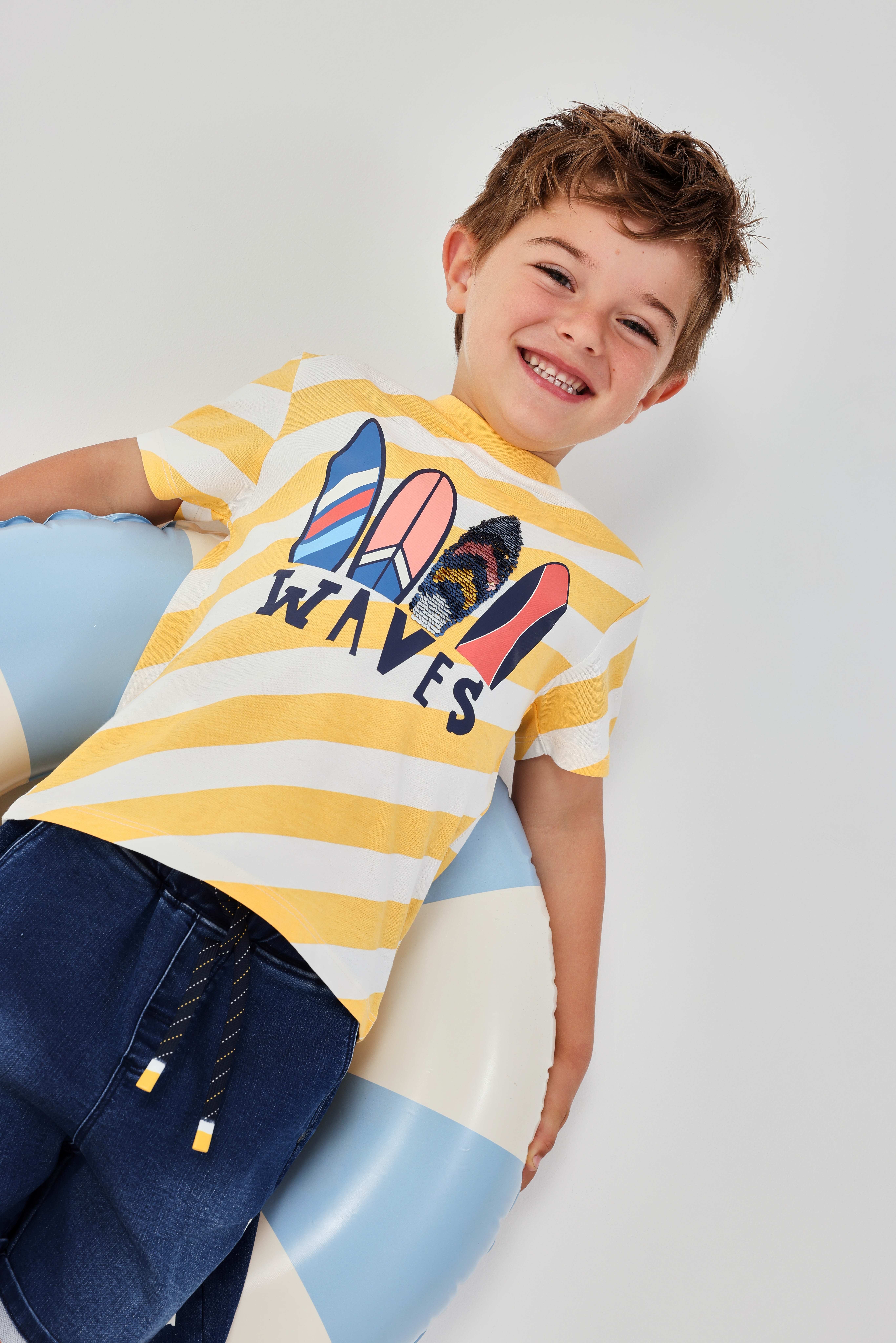 Chlapecké tričko s pruhy a surfy. Pohodlné tričko z jemné bavlny, dobře drží tvar. Pruhovaný vzor a surfy navozují pravou letní atmosféru.
