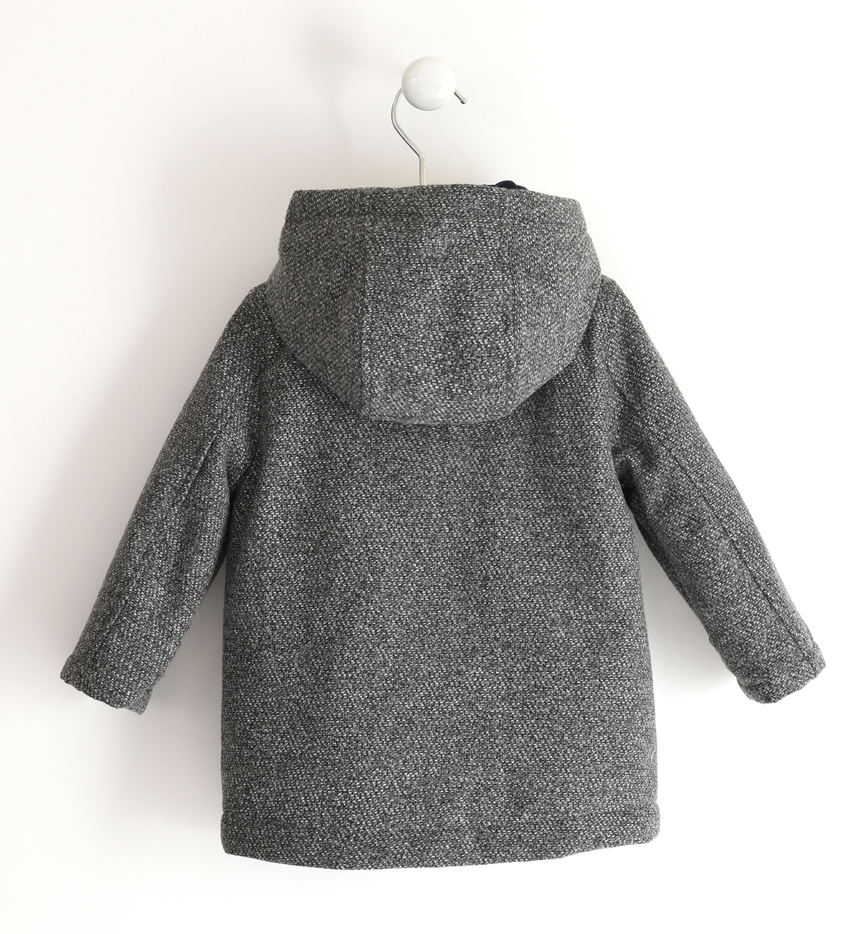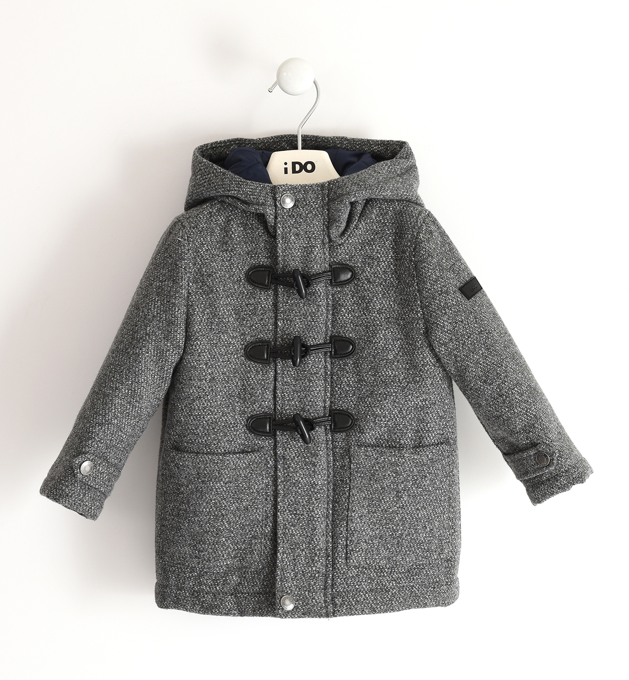 Dětský kabát IDO, duffle coat, vyrobený z hřejivé strečové meltonové tkaniny. Kabát je podšitý, vycpaný vatelínem, má kapuci a dvojité zapínání na skrytý zip a typické žabky