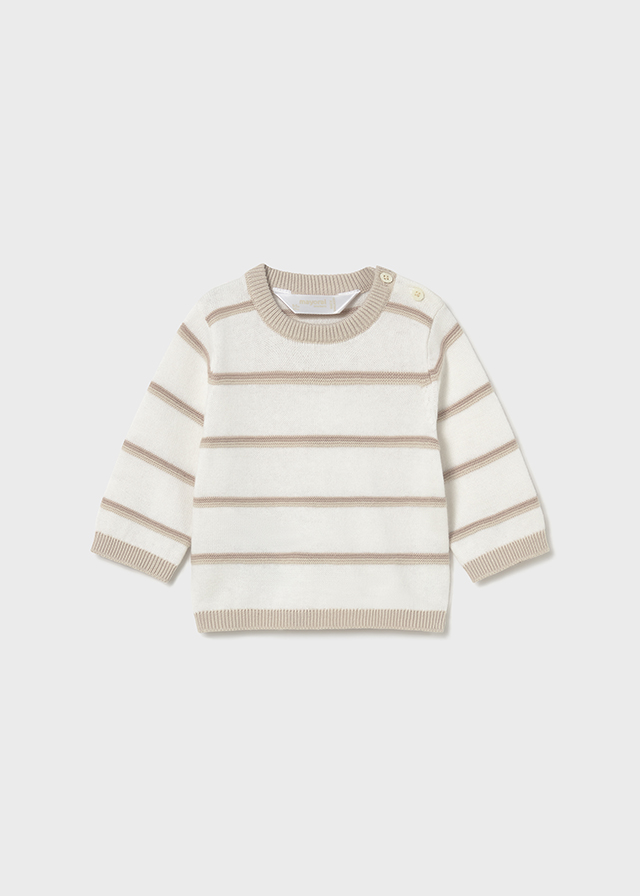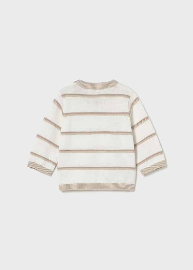 Jemný svetřík pro každý den. Měkký pletený svetr s jemnými proužky, dlouhým rukávem a praktickým zapínáním na rameni. Pohodlný na nošení, ideální na běžné dny i rodinné návštěvy.