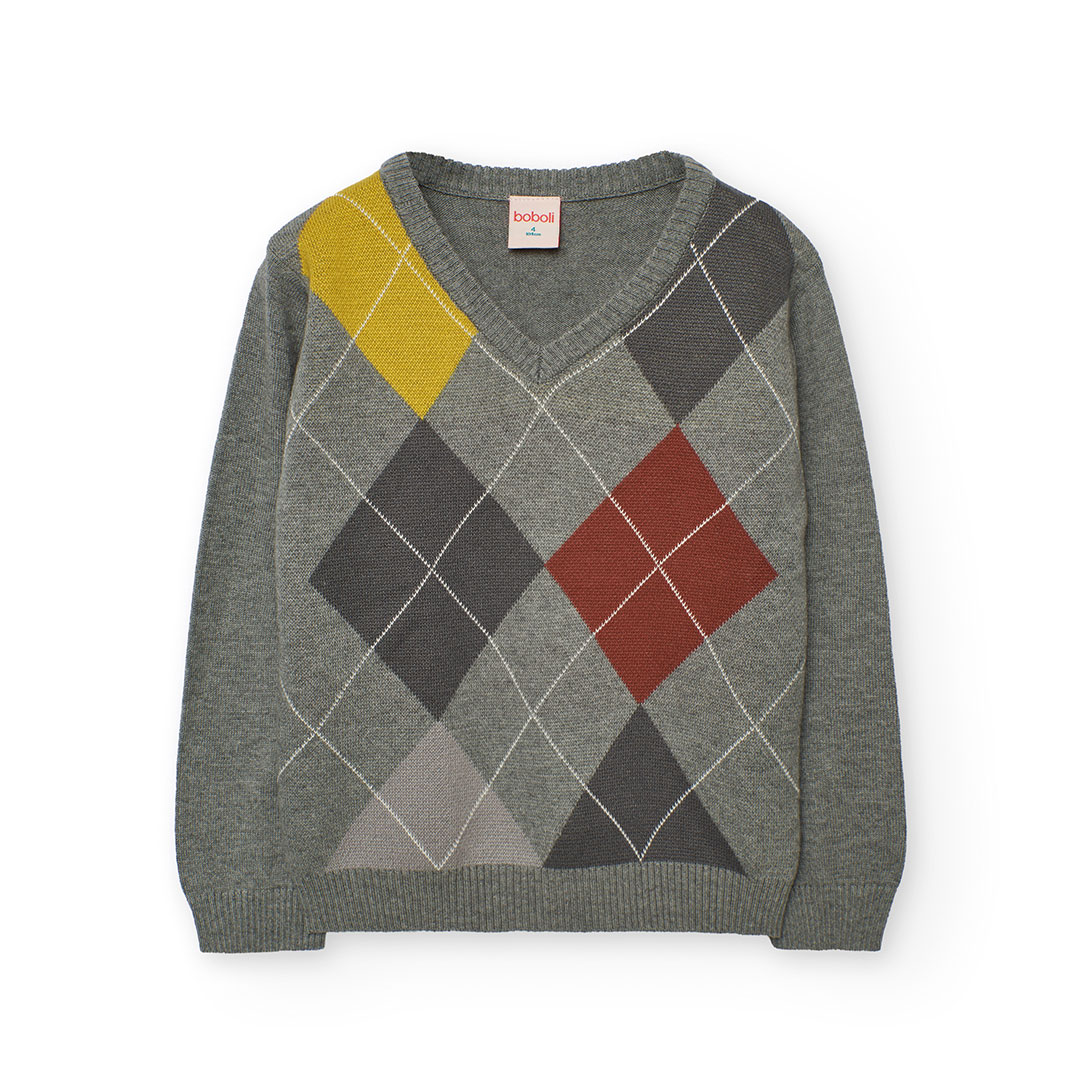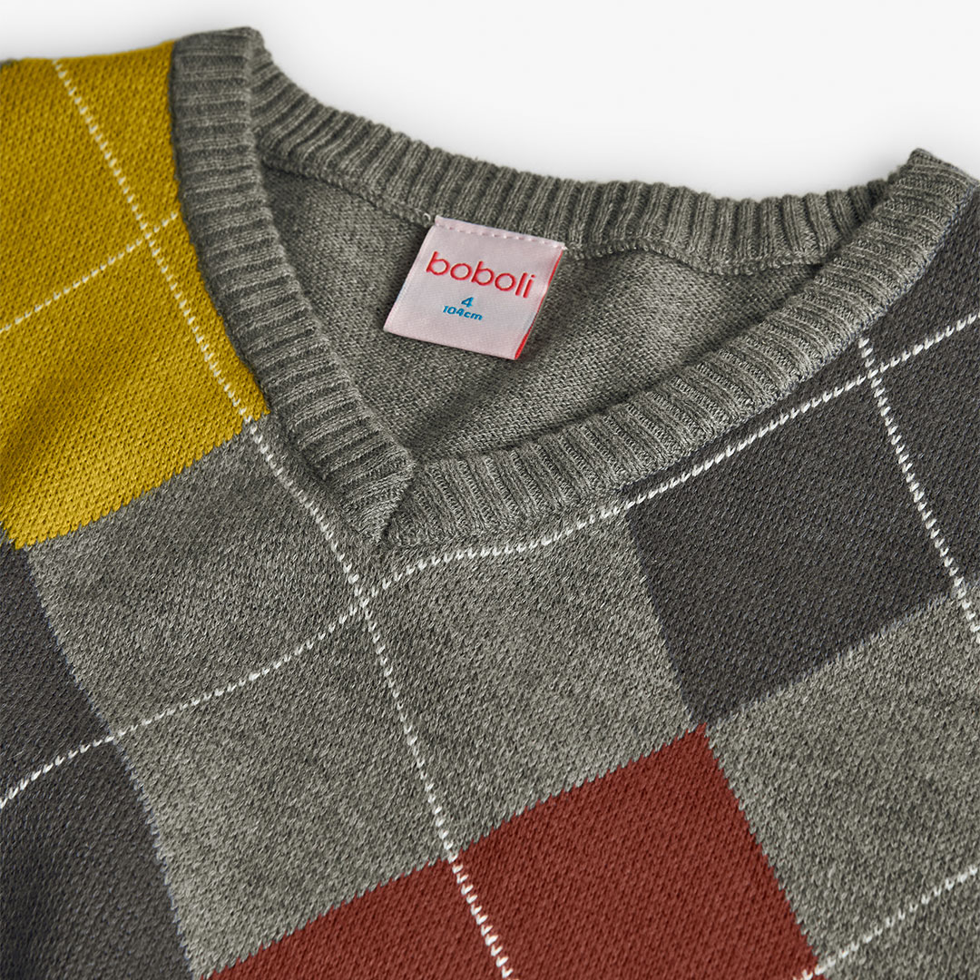 Klasický svetr pro malé elegány. Chlapecký pletený svetr s nadčasovým kostkovaným vzorem a výstřihem do V přináší styl a pohodlí do každého outfitu. Kombinace šedých tónů s akcenty žluté a červené oživí každodenní i slavnostní vzhled. Měkký materiál zahřeje během chladných dnů.