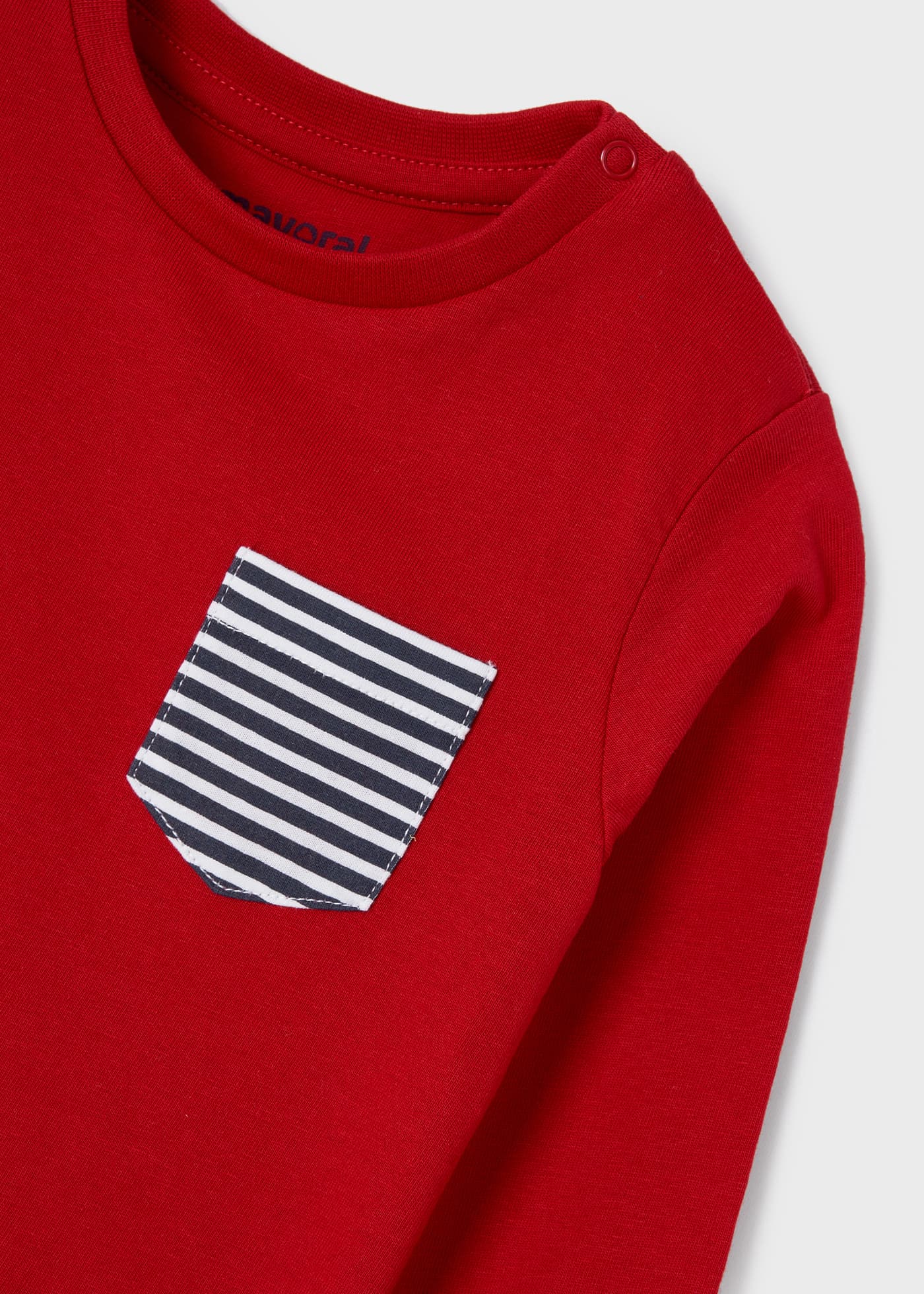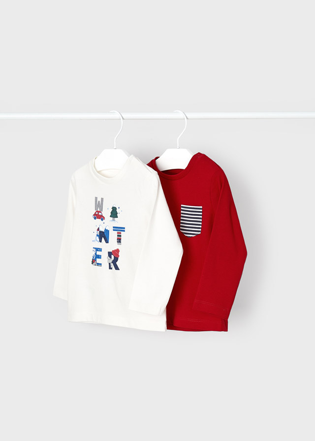 Chlapecký set dvou tríček s dlouhým rukávem . Kulatý výstřih. Vyrobeno ze 100% bavlněné tkaniny. Funkční přední kapsa. Dekorativní prvky: ozdobná nášivka.