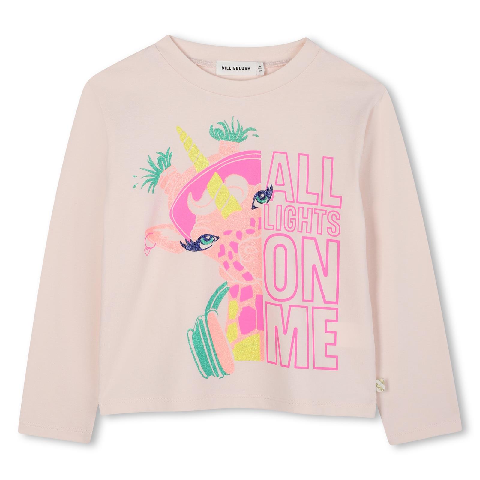 Dívčí tričko Billieblush z bavlny s dlouhým rukávem a potiskem. Stylové dívčí tričko Billieblush je vyrobené ze 100% měkké bavlny, která zajistí maximální pohodlí při nošení. Tričko má kulatý výstřih, dlouhé rukávy a volnější komfortní střih, který je ideální pro každodenní outfit.Přední stranu zdobí originální ilustrace potištěná lesklým inkoustem, která dodává tričku hravý a moderní vzhled. Kvalitní zpracování a ikonický štítek Billieblush podtrhují prémiový charakter tohoto kousku.