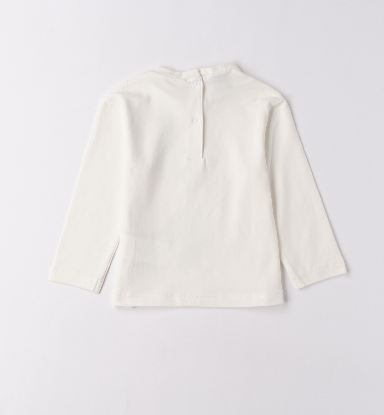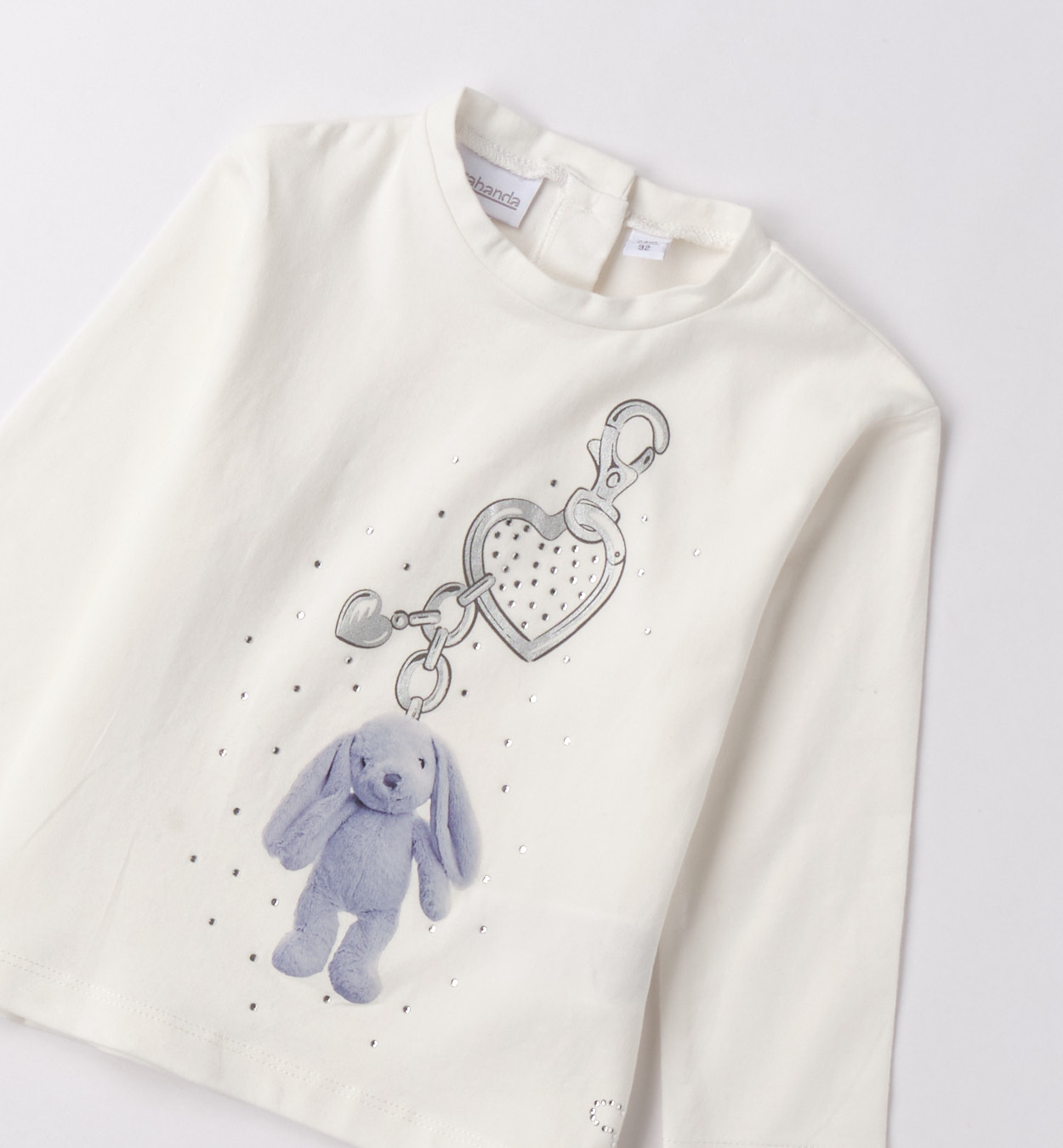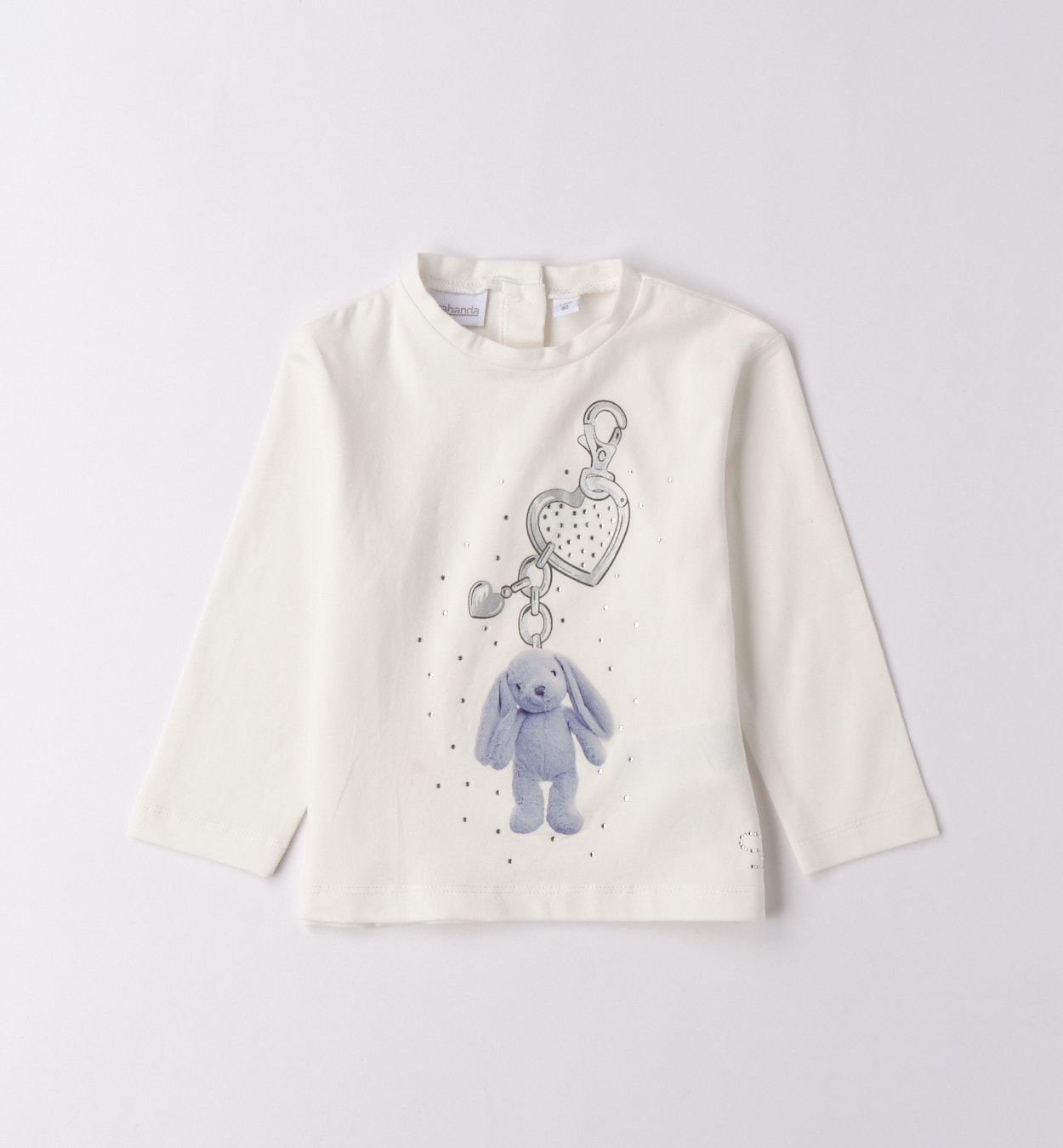 Tričko s detailním motivem klíčenky. Bílé tričko s dlouhým rukávem zdobené motivem plyšového zajíčka zavěšeného na stříbrné klíčence ve tvaru srdce. Lesklé kamínky kolem potisku dodávají slavnostní vzhled. Elegantní volba pro malé slečny.