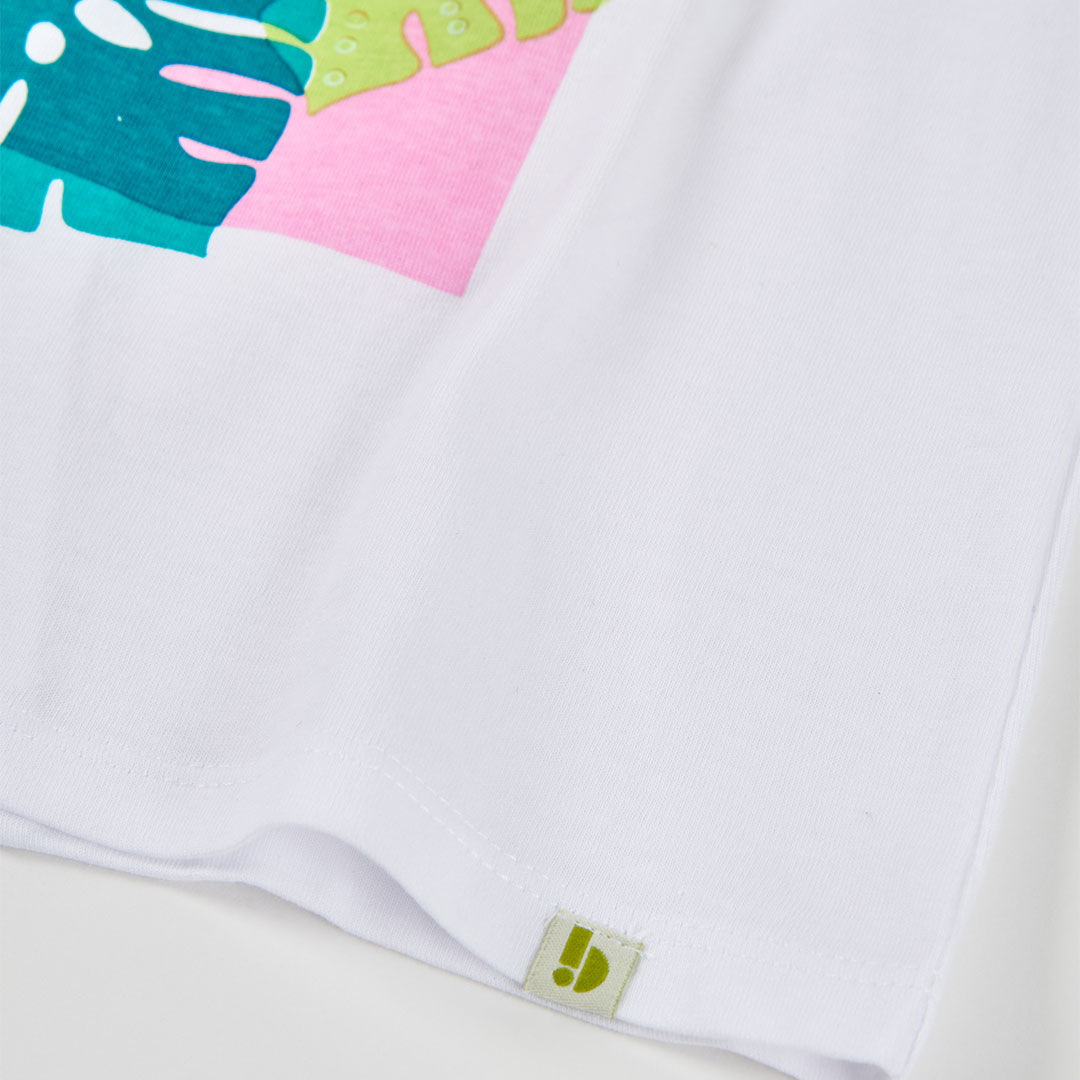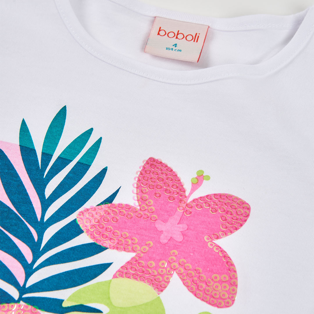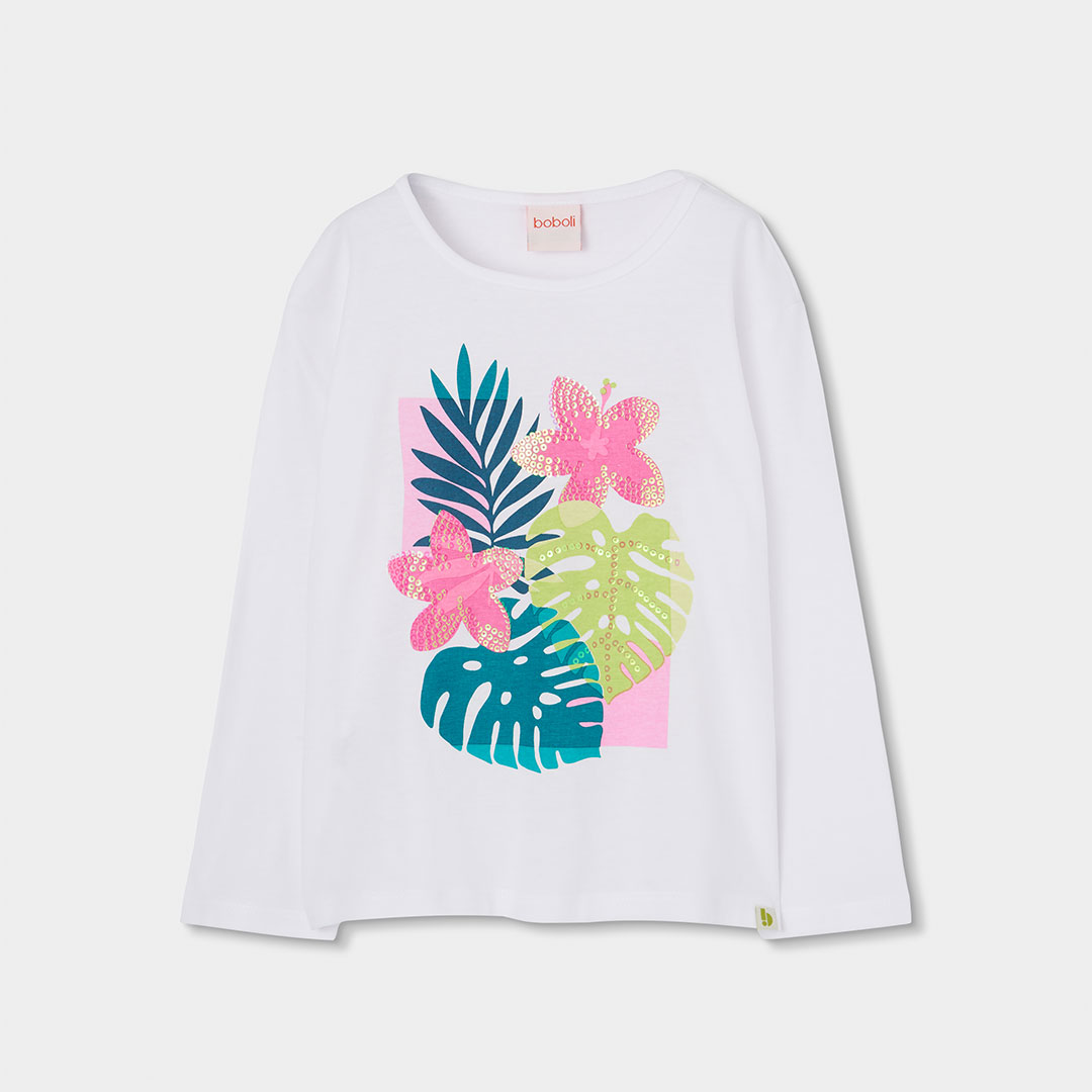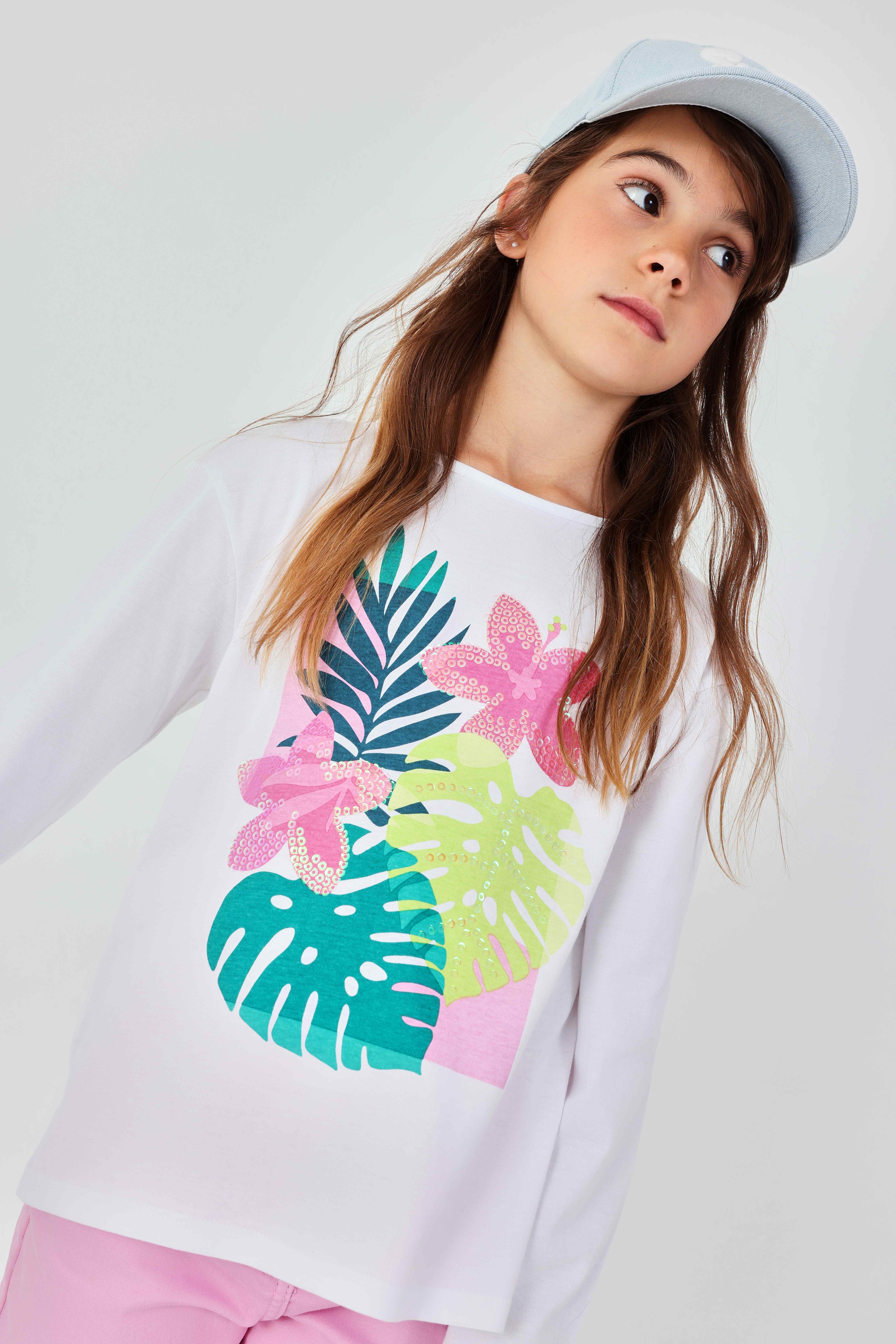 Dívčí tričko s dlouhým rukávem a potiskem. Bílé dívčí tričko s dlouhým rukávem a výrazným tropickým potiskem. Skvělé pro chladnější letní dny i vrstvení během jara.