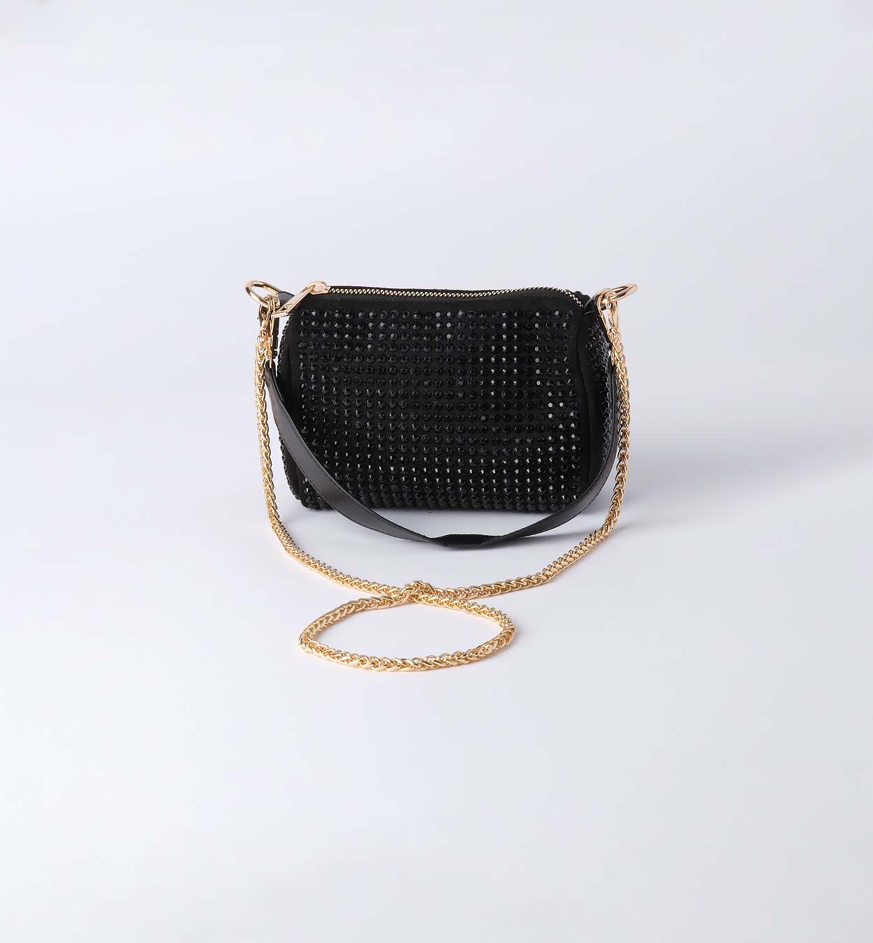 Trendy kabelka s černými flitry. Dívčí kabelka v černé barvě zdobená drobnými flitry pro třpytivý efekt. Zlatý řetízek dodává elegantní vzhled a umožňuje pohodlné nošení. Ideální doplněk na oslavy, rodinné akce i večerní příležitosti. Zapínání na zip udrží všechny drobnosti v bezpečí.