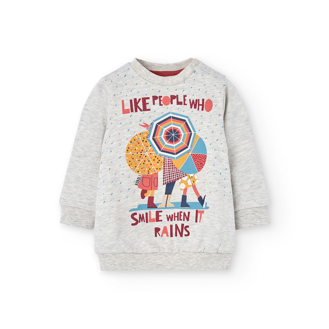 Dívčí komplet s veselým motivem deštníku. Veselý dívčí komplet skládající se z pohodlné mikiny s dlouhým rukávem a legín. Mikina zdobena nápisem "Like people who smile when it rains" a barevným potiskem s deš