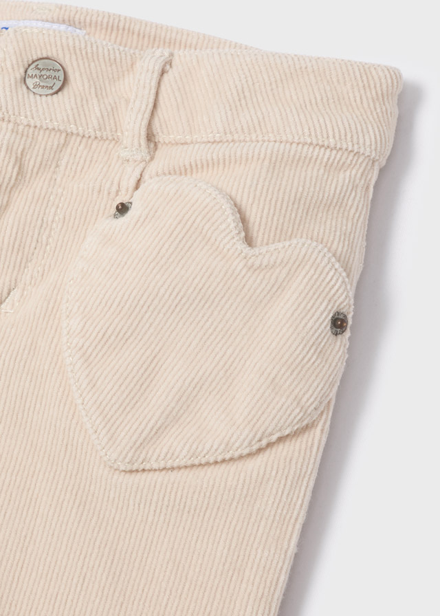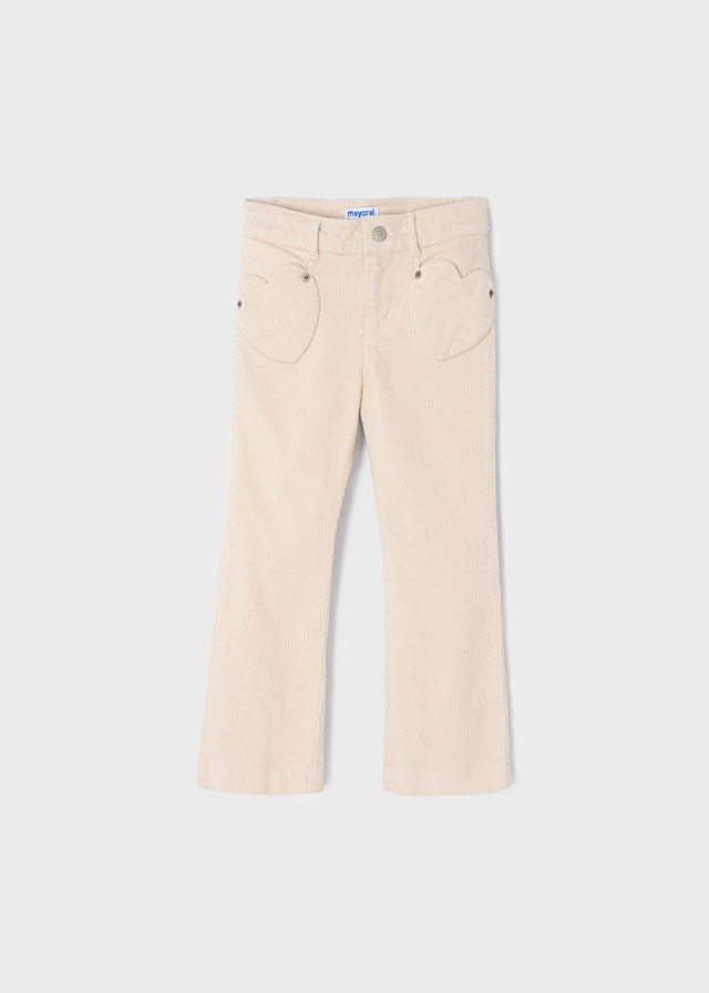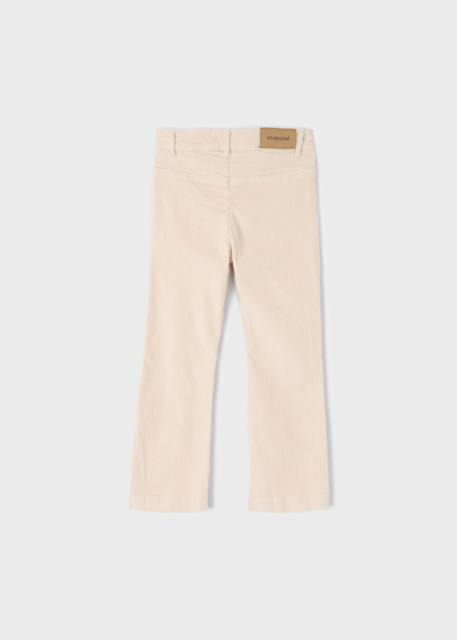 Dívčí kalhoty, přiléhavý střih na bocích a kolenech a rozšířený spodní lem. Normální střih. Přední zapínání na zip s patentními knoflíky. Vyrobeno z pohodlné a měkké manšestrové tkaniny. Funkční přední kapsy.