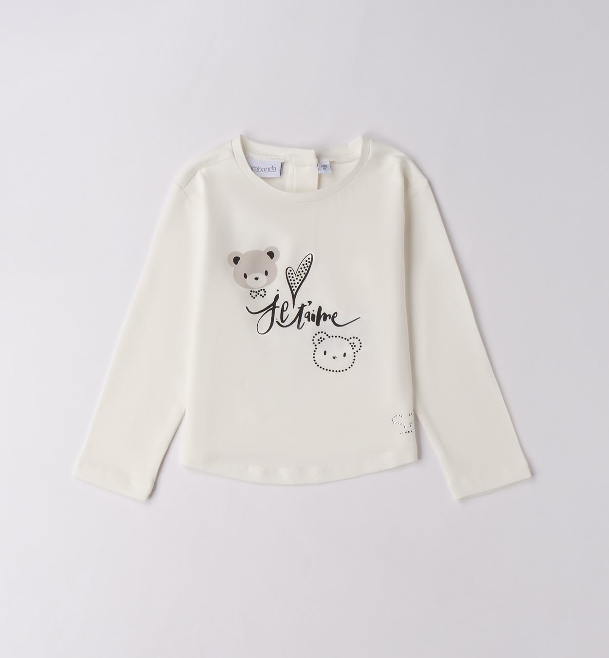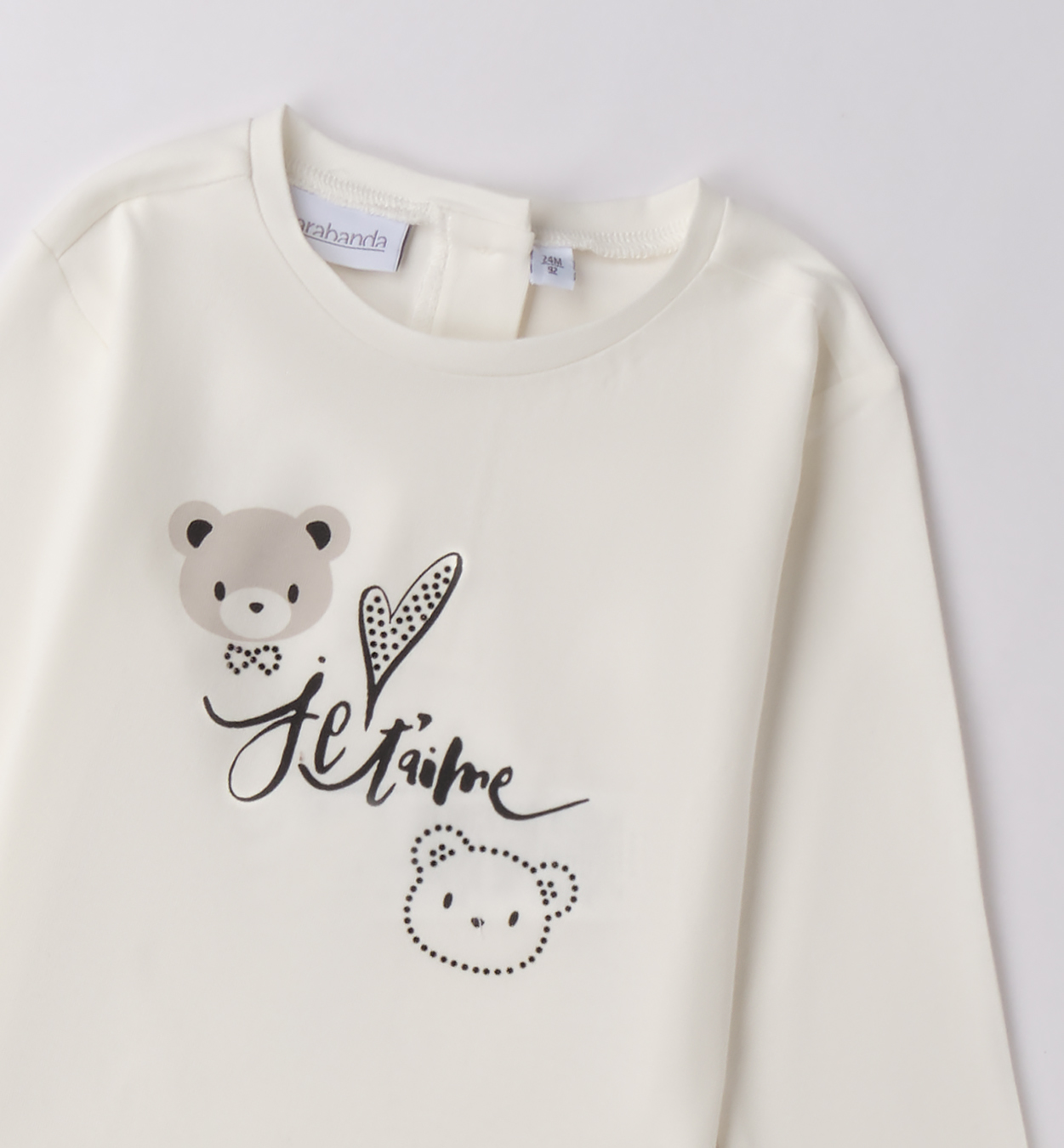 Jemné tričko s medvídky a nápisem Je t'aime. Krémové dívčí tričko s dlouhým rukávem a roztomilým potiskem dvou medvídků, srdíčka a nápisem „Je t’aime“. Elegantní a jemný vzhled vhodný na každodenní nošení i speciální příležitosti.