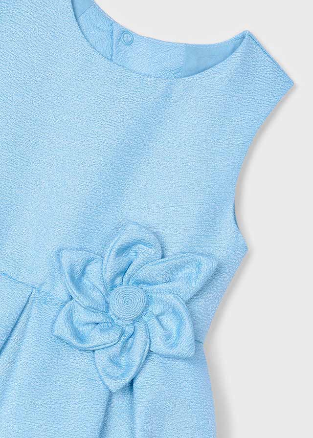 Slavnostní dívčí šaty ve světle modré barvě od značky Mayoral. Elegantní střih bez rukávů s výrazným květinovým detailem na pase dodává modelu půvab a noblesu. Lesklý materiál s jemným třpytem zajišťuje výjimečný vzhled pro každou slavnostní příležitost – svatby, křtiny nebo rodinné oslavy. Díky kvalitnímu zpracování jsou šaty nejen krásné, ale i pohodlné na nošení.