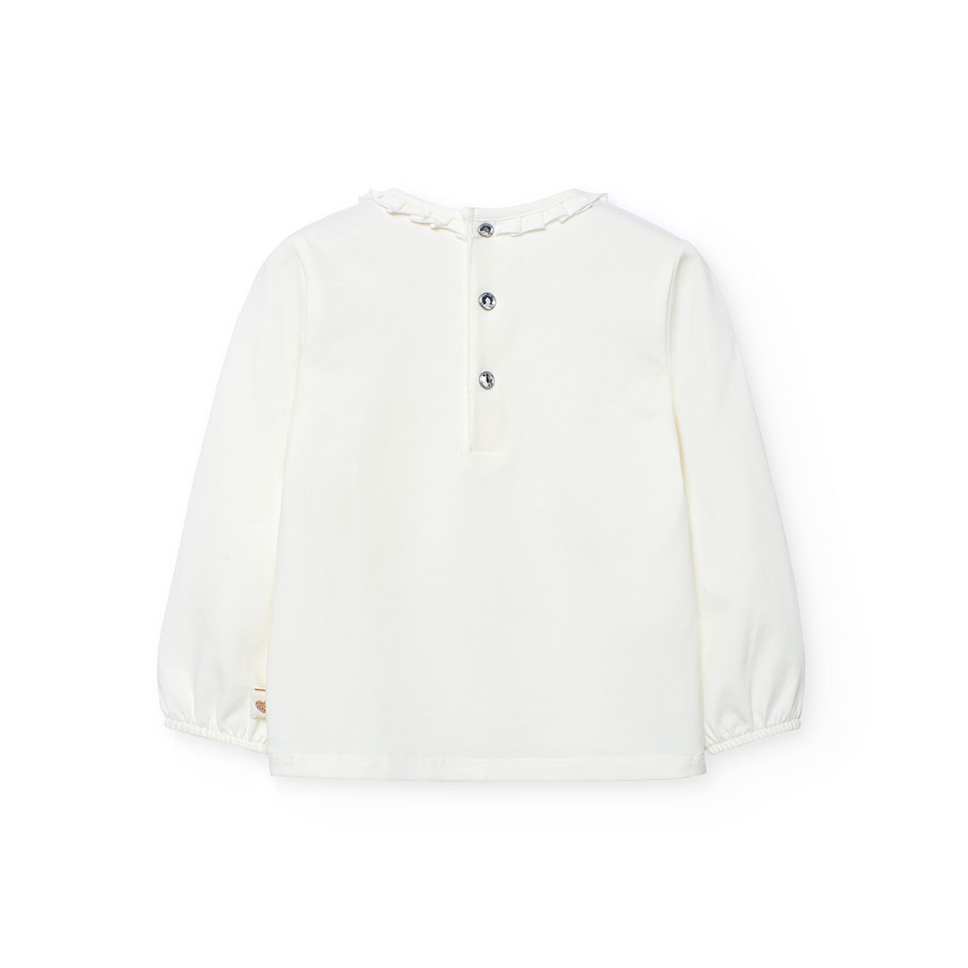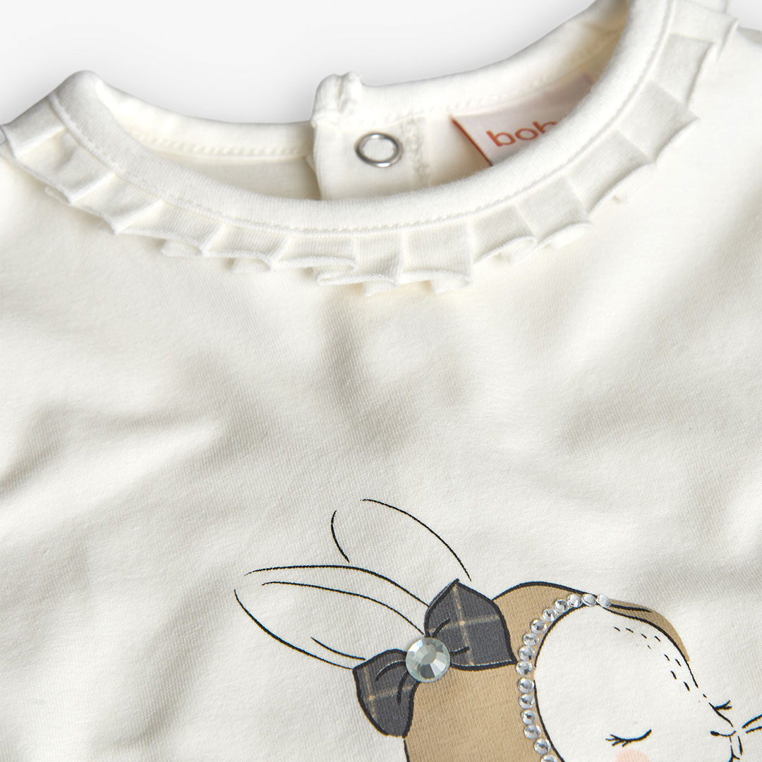 Roztomilé tričko s motivem králíčka. Dívčí tričko v krémové barvě s potiskem králíčka zdobeným třpytivými detaily a měkkou bambulkou. Krásný volánek u výstřihu dodává jemný a roztomilý vzhled. Příjemný bavlněný materiál vhodný pro každodenní nošení i sváteční chvíle.