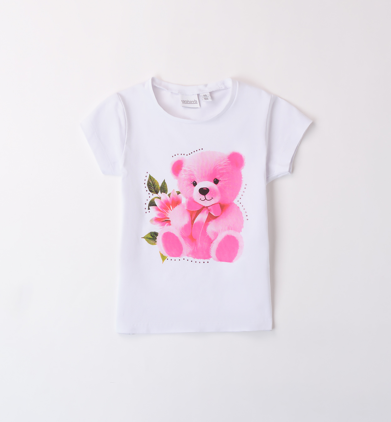 Roztomilý medvídek pro holčičky. Tričko s krátkým rukávem z příjemné bavlny, zdobené roztomilým růžovým medvídkem vpředu. Ideální volba pro letní dny, které oživí každý outfit.