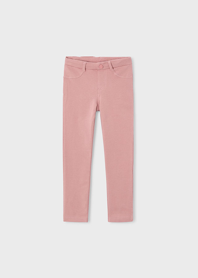 Pohodlný střih a hebká růžová. Dívčí kalhoty v jemném růžovém odstínu kombinují pohodlí legín a vzhled klasických džín. Elastický pas a pružný úplet zajišťují pohodlné nošení po celý den. Zadní kapsy s ozdobným prošitím a kovový štítek srdíčka dodávají kalhotám stylový detail.