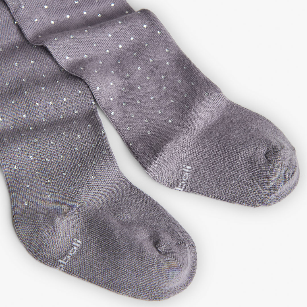 Jemné punčocháče s třpytkami v šedé barvě. Jemné dívčí punčocháče v šedé barvě zdobené třpytivými detaily. Skvěle doplní šaty a sukně v tlumených barvách, ideální pro podzimní a zimní období.